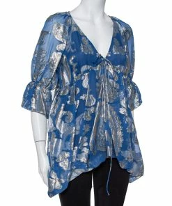 Flash Sale βοΈ Stella McCartney Blue Floral LamΓ© Asymmetrical Hem Top M For π© Women π§¨