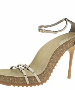 These Stella McCartney sandals are stylish and fun that you will absolutely love . They are made from beige leather with front toe straps, buckled ankle straps, and cork platforms. Their insoles are unlined.