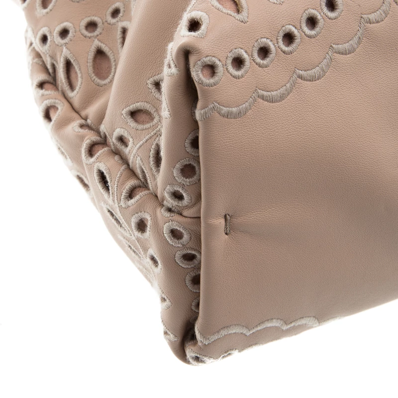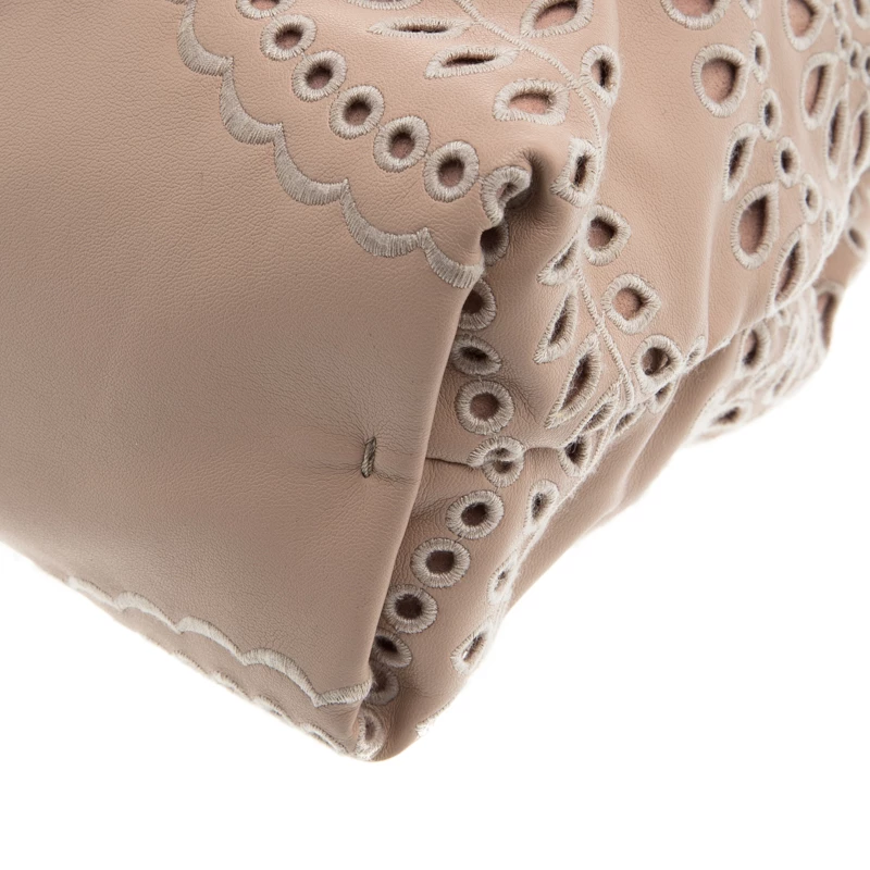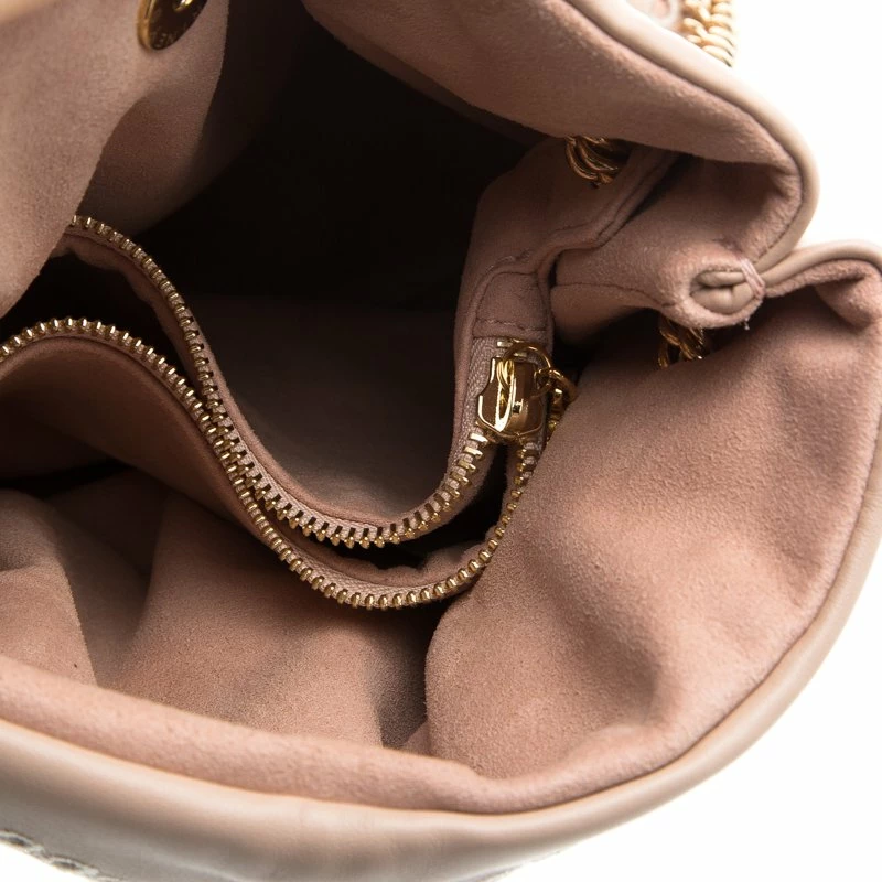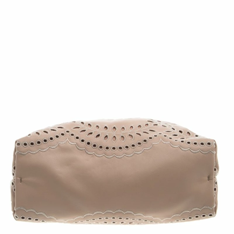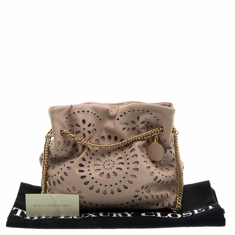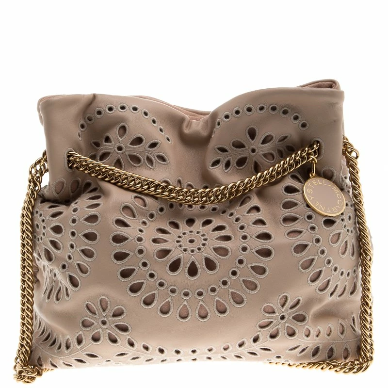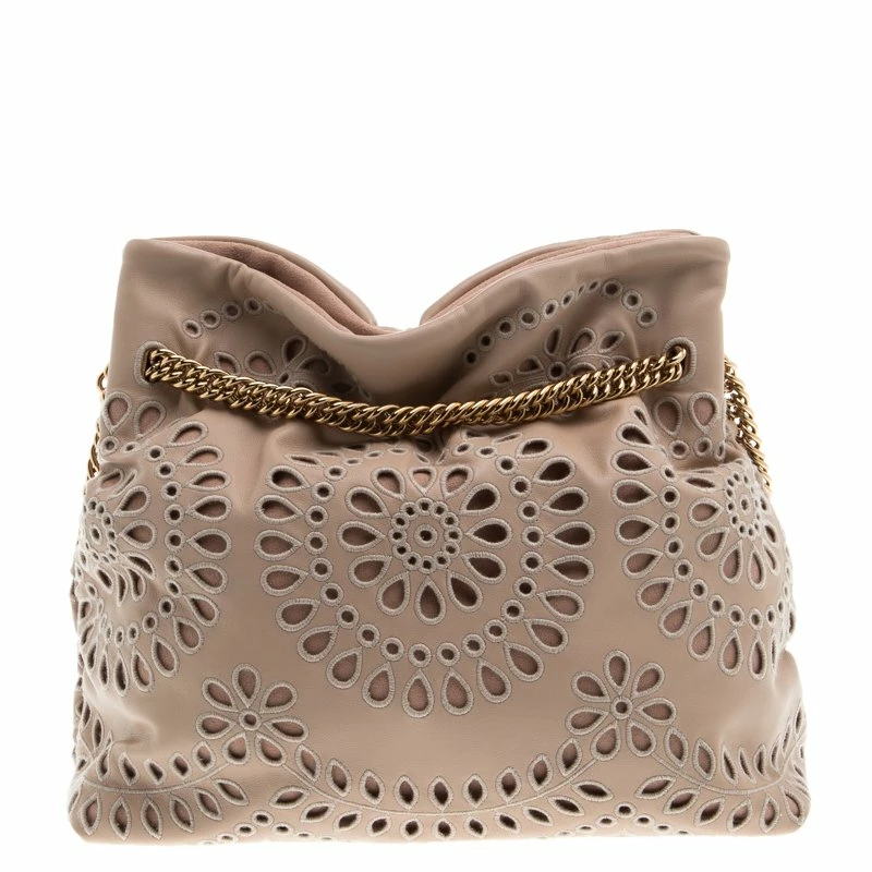 The chic bucket bag from Stella McCartney in beige is crafted in faux leather. Accentuated with a gold chain shoulder strap the Eyelet Noma bag is a fashionista’s choice! Featuring perforated floral cut-outs all over, the bag opens into a faux suede interior with dual compartments divided by a zip compartment.