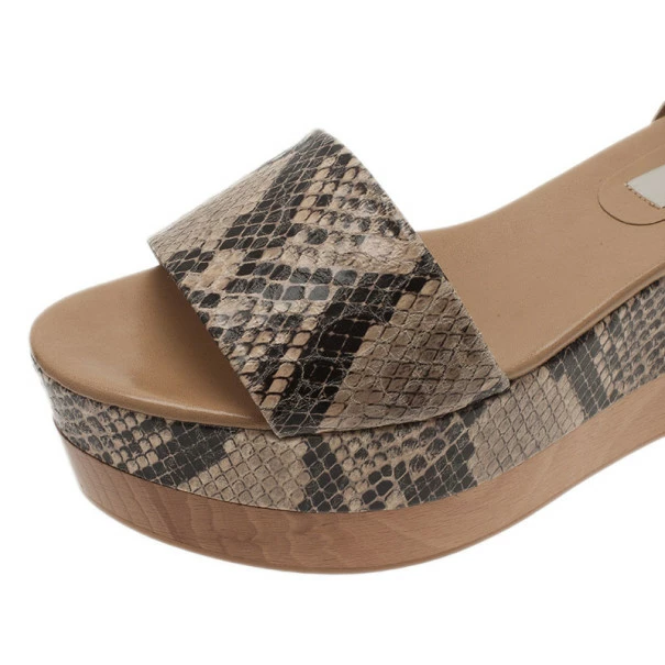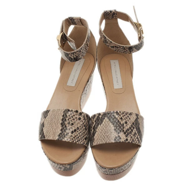By Stella McCartney, these wedges go with this season’s trend, flatforms. Made from faux python, they feature an open toe, an ankle strap with a side buckle fastening, a platform sole and a wedge heel.