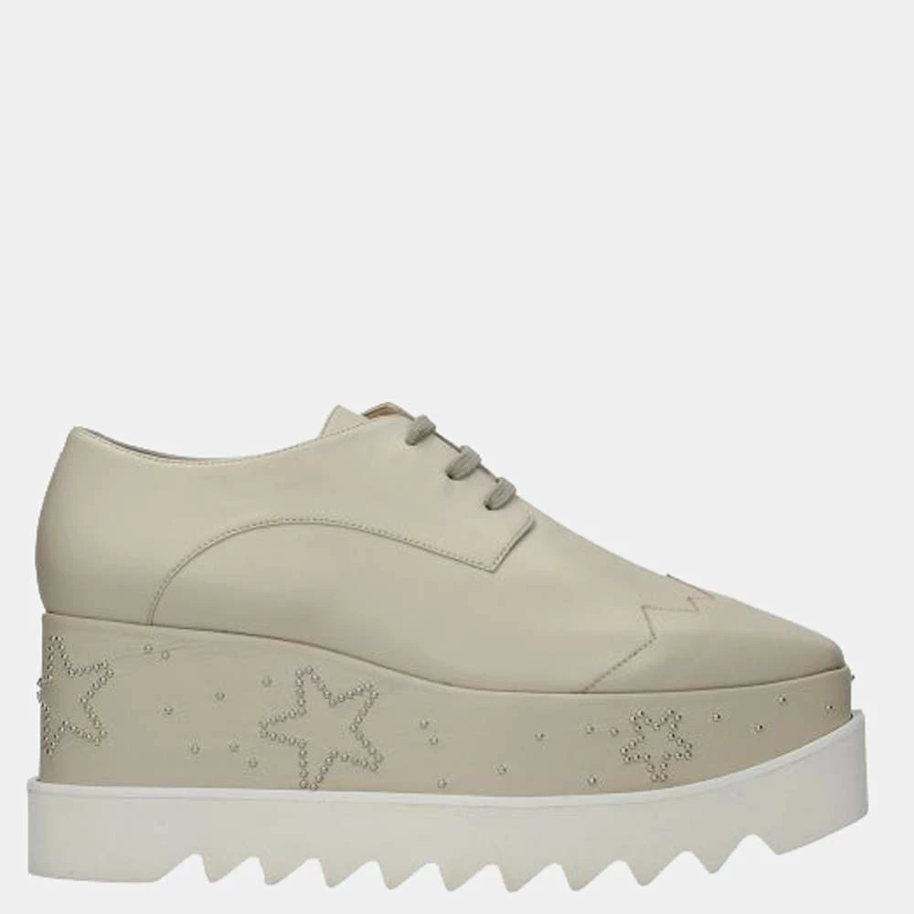 The house of Stella McCartney presents this beautiful and elegant pair of casual shoes. It has a beige exterior with embroidered stars. These kicks have white crocodile teeth gripped soles. It has a closed toe style with a laced up finish. Pair with denim jeans.