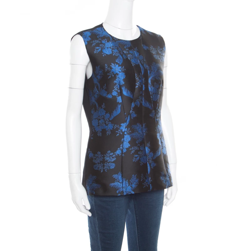 Look your fashionable best in this sleeveless top from Stella McCartney. It is made of 100% polyester and features a black and blue floral jacquard pattern all over it. The peplum silhouette adds to its appeal and makes it look amazing. It comes equipped with a concealed zip closure at the back and can be paired well with slim fit pants and pointed stilettoes for a special outing.