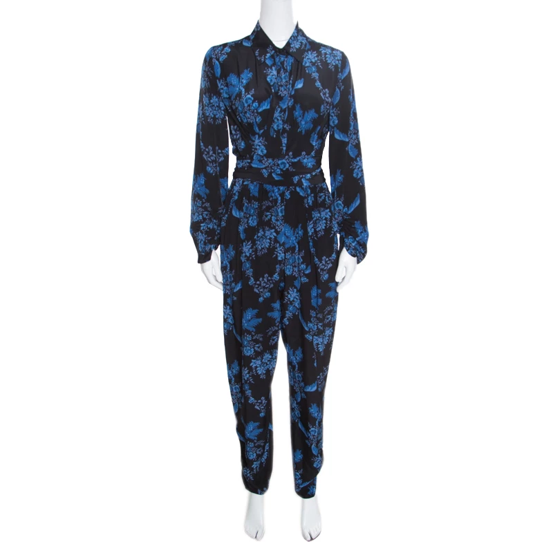 Jumpsuits never go out of style and Stella McCartney is here to prove that with this chic black and blue creation. This jumpsuit is made of 100% silk and features a lovely floral print all over it. It flaunts a collared neckline, a belt at the waist and long sleeves. Sure to lend you a great fit, it can be paired well with stiletto heels and a trendy bag to rock a fashionable evening.