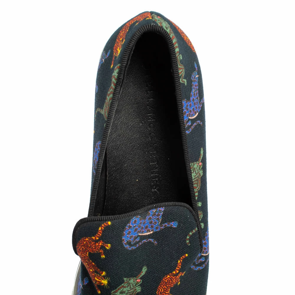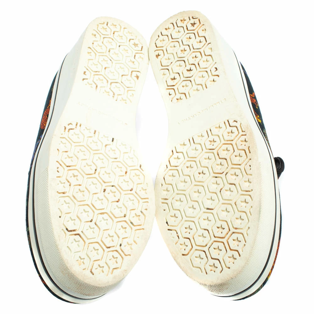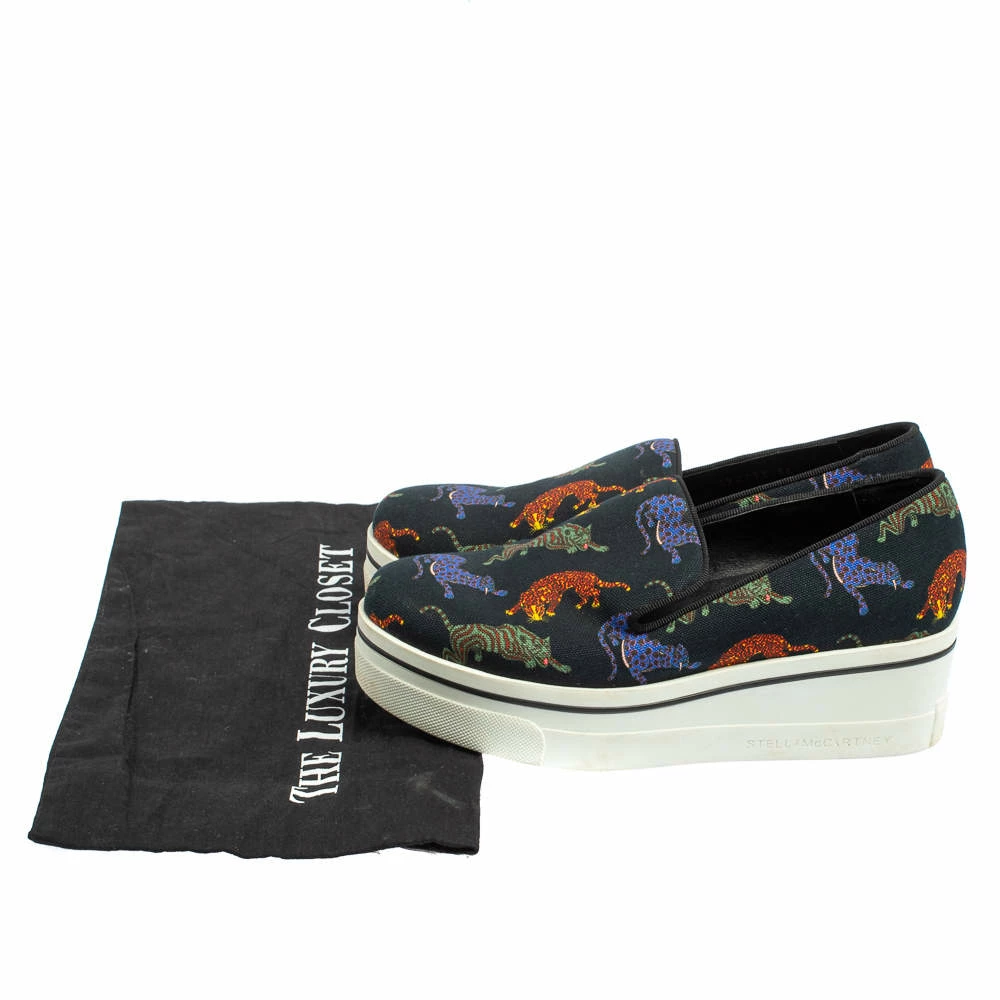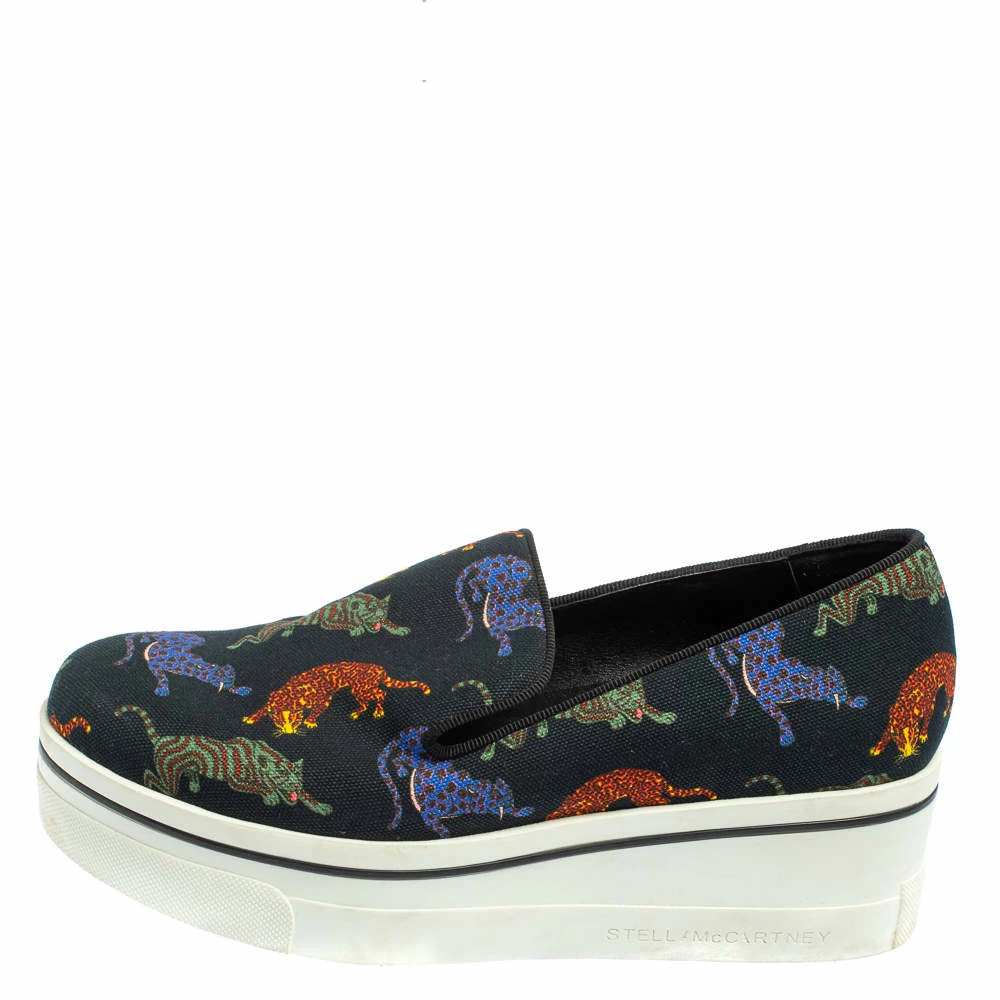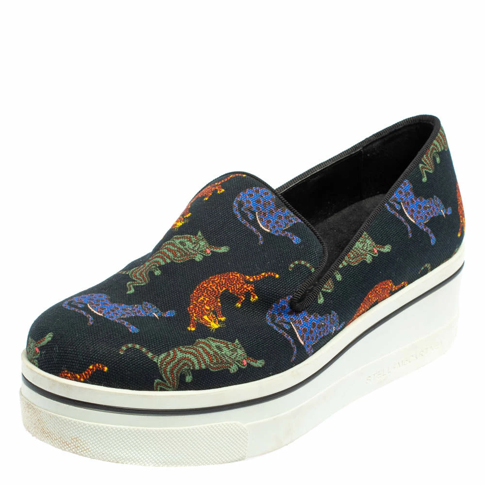 Stella McCartney’s love for animals is vividly displayed on these sneakers. Crafted from canvas, they feature feline animals printed atop a black backdrop. These sneakers are elevated on chunky platforms.