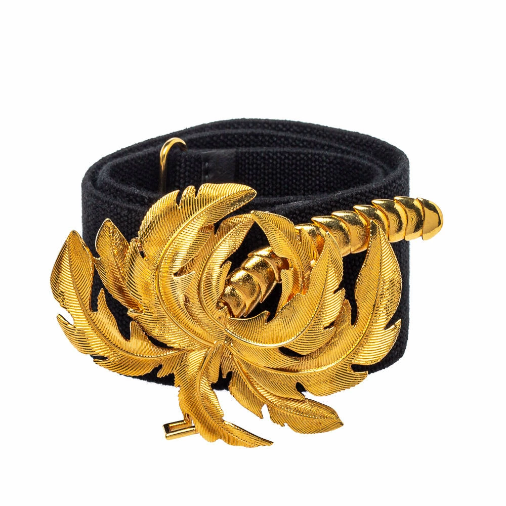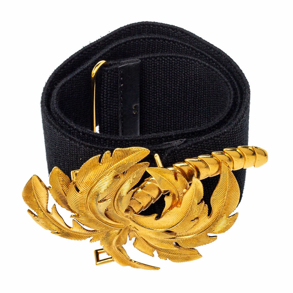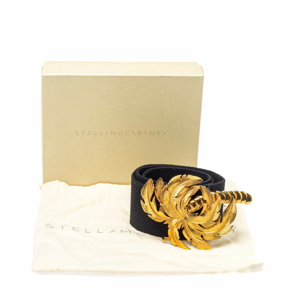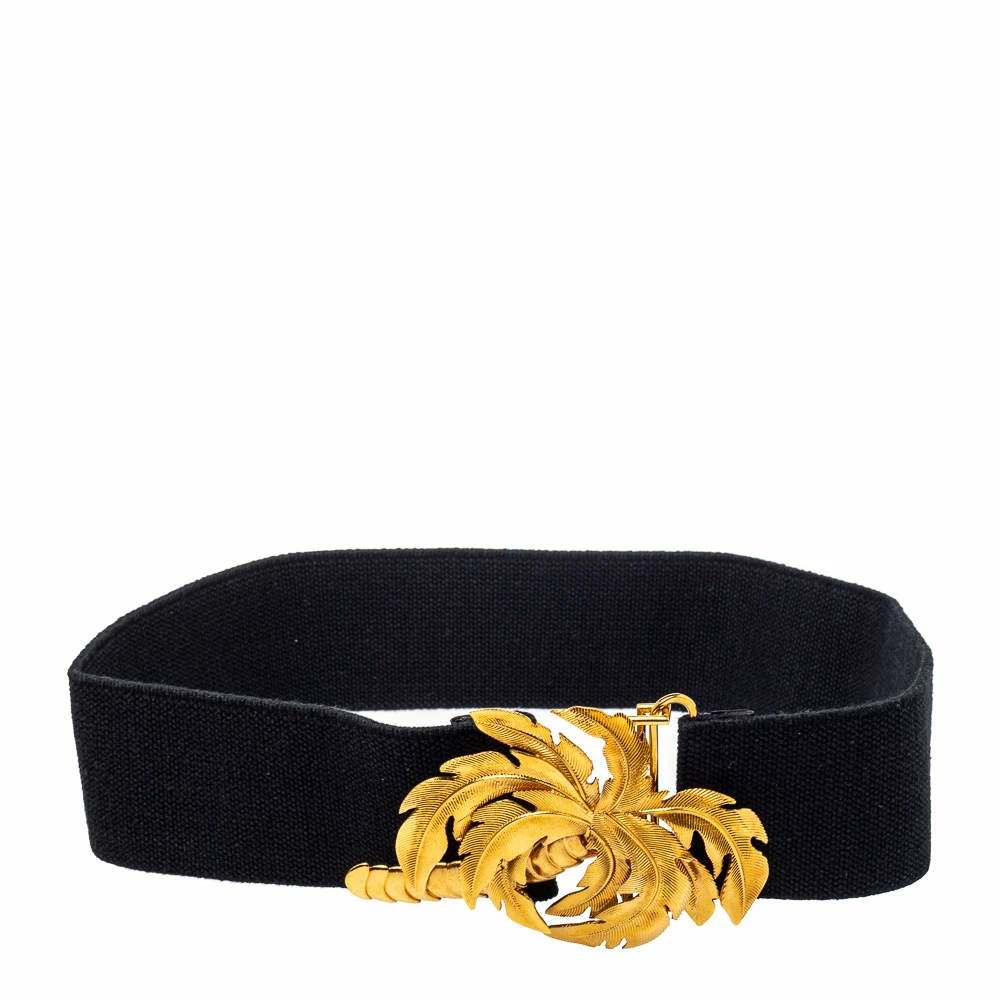 This belt from Stella McCartney will be your new favorite statement accessory. It has a minimalist design rendered in black canvas and accented with a palm tree buckle in gold-tone metal. This belt will complement your versatile fashion choices effortlessly.