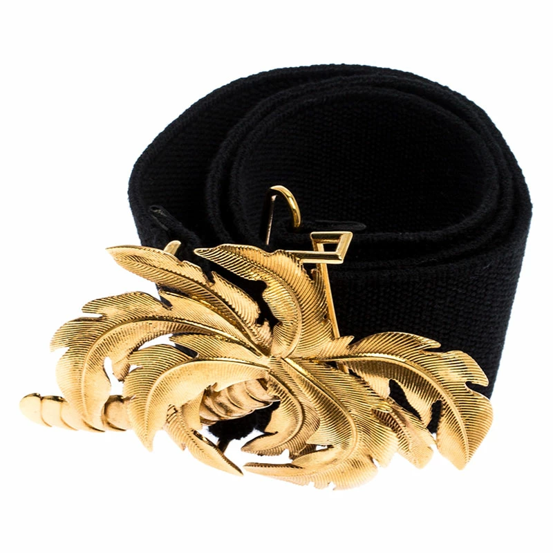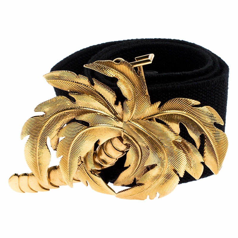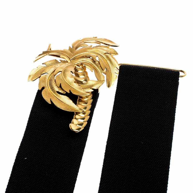 This belt from Stella McCartney will be your new favorite statement accessory. It has a minimalist design rendered in black canvas and accented with a palm tree buckle in gold-tone metal. This belt will complement your versatile fashion choices effortlessly.