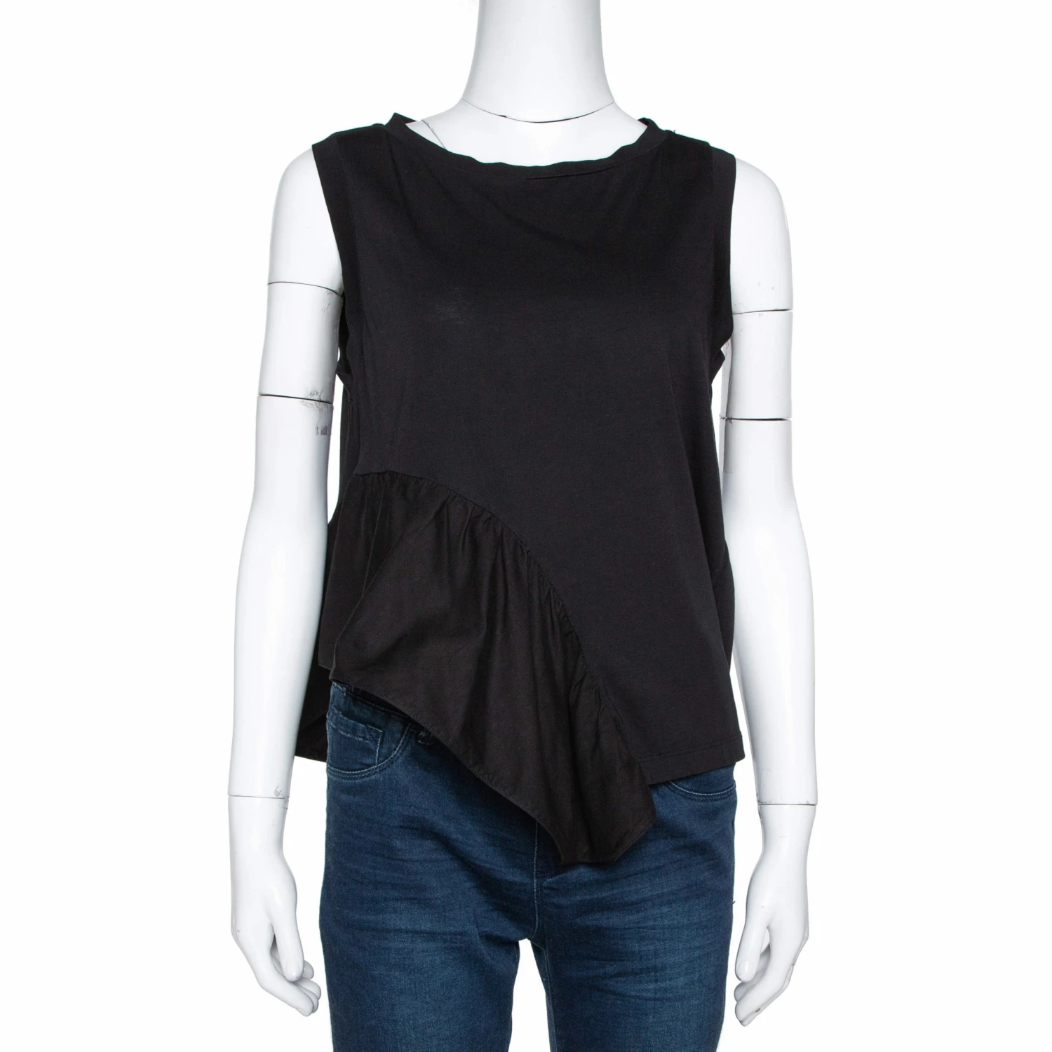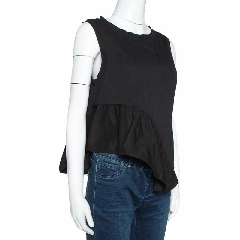 Stella McCartney brings to you this lovely top that can be paired with almost anything in your closet. This cotton top in black has a sleeveless cut, a simple neckline and an asymmetrical ruffle detail. It is sure to give you a comfortable fit.