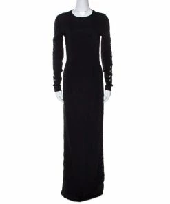 Perfect for formal occasions and special evenings, this stylish and sophisticated maxi dress comes from the house of Stella McCartney. Crafted from quality materials, it comes with a 100% silk lining and carries a black hue. It is styled with long sleeves, a round neck and a hemline that grazes the floor. It is beautified with lace trims on the sleeves and sides that add glamour and femininity.