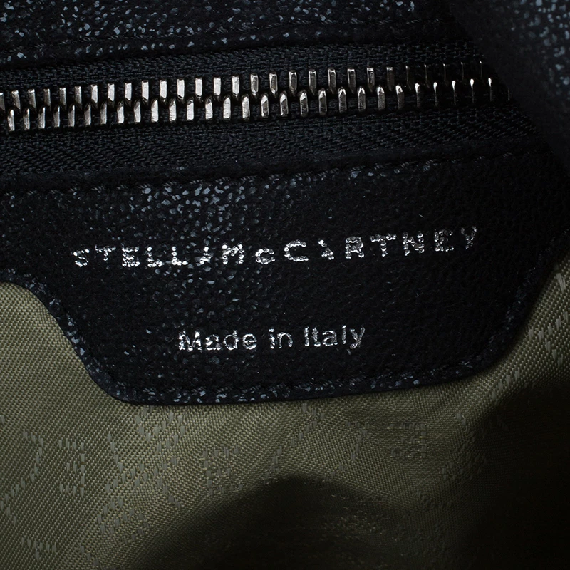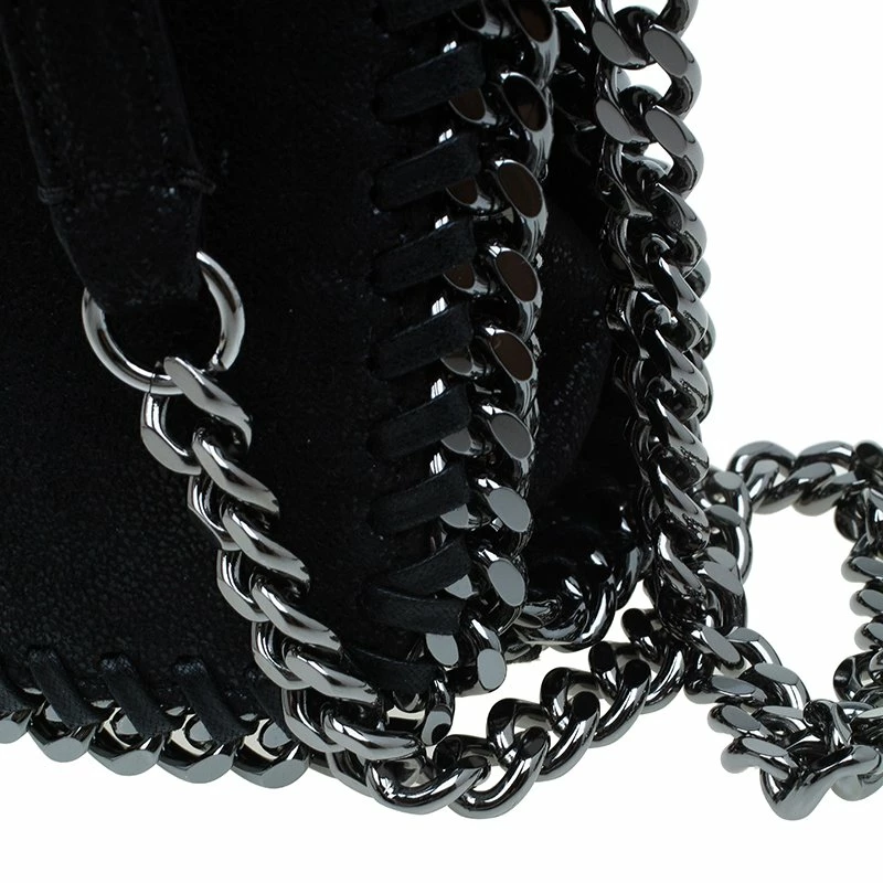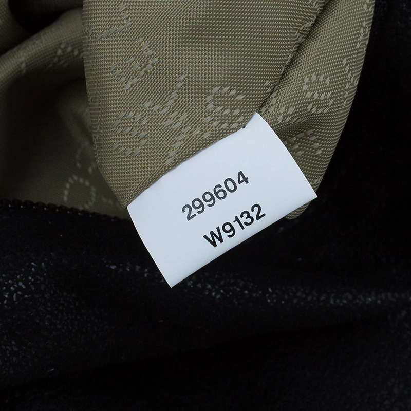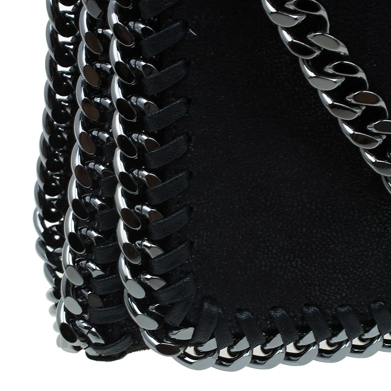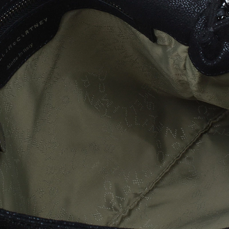Part of the Falabella collection, this Stella McCartney bag is a black beauty. Made from polyester, its leather-like exterior has a suede feel to it, giving it a smooth and luxurious appearance. Its stitched trim attached the chain link to its side, creating a rocker chic look. Its versatility comes from the dark silver hardware that forms the top handles and shoulder strap. The interior has a magnetic snap closure and is lined with monogrammed textile and features one zip pocket.