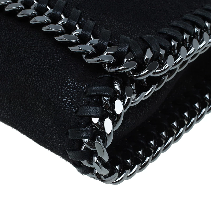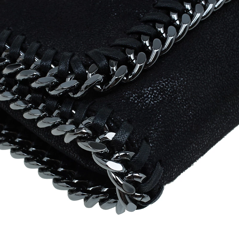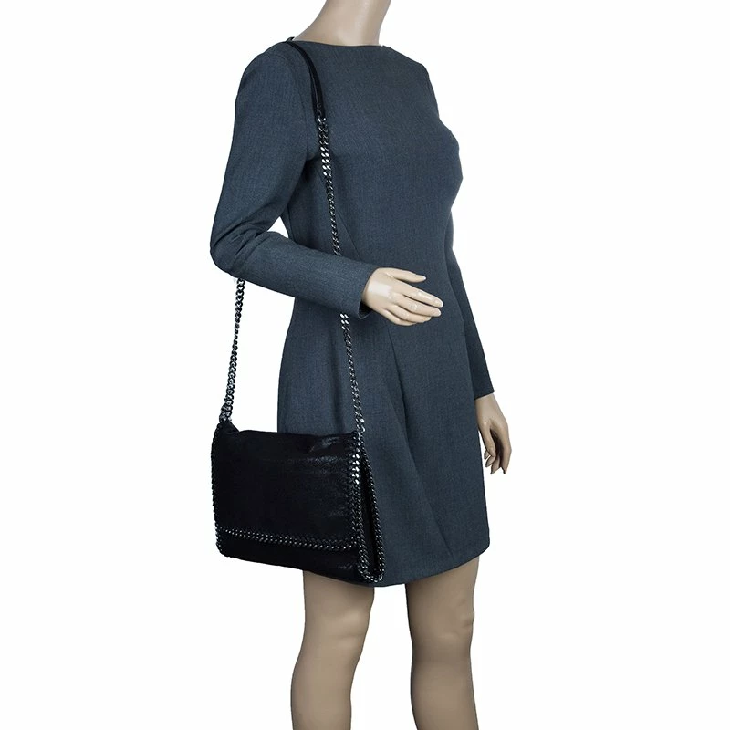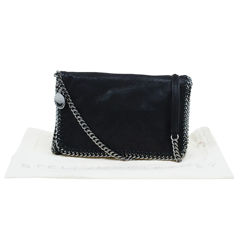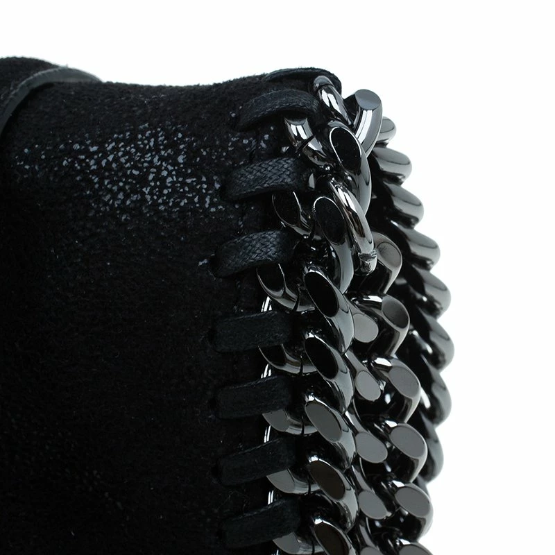 Part of the Falabella collection, this Stella McCartney bag is a black beauty. Made from polyester, its leather-like exterior has a suede feel to it, giving it a smooth and luxurious appearance. Its stitched trim attached the chain link to its side, creating a rocker chic look. Its versatility comes from the dark silver hardware that forms the top handles and shoulder strap. The interior has a magnetic snap closure and is lined with monogrammed textile and features one zip pocket.