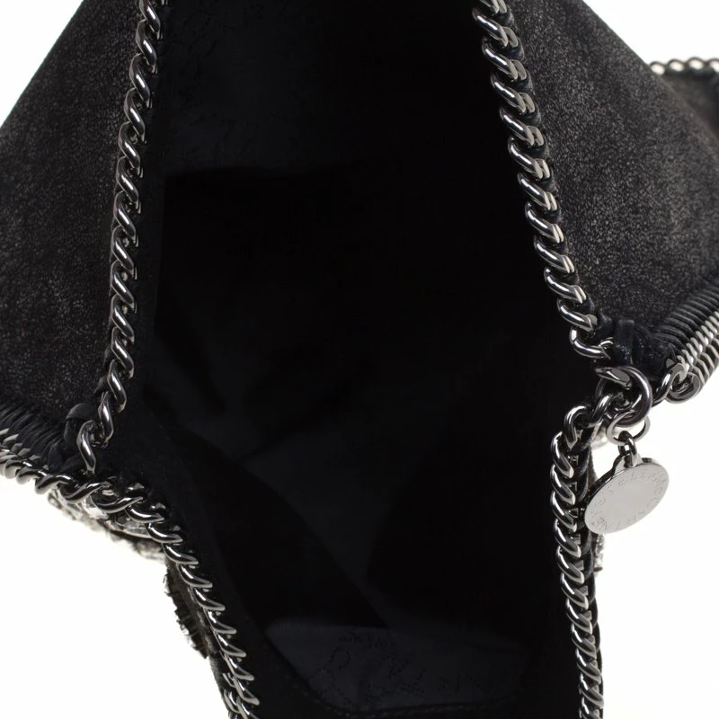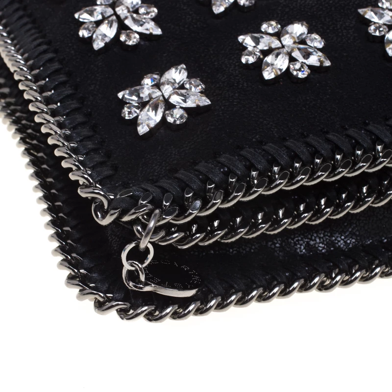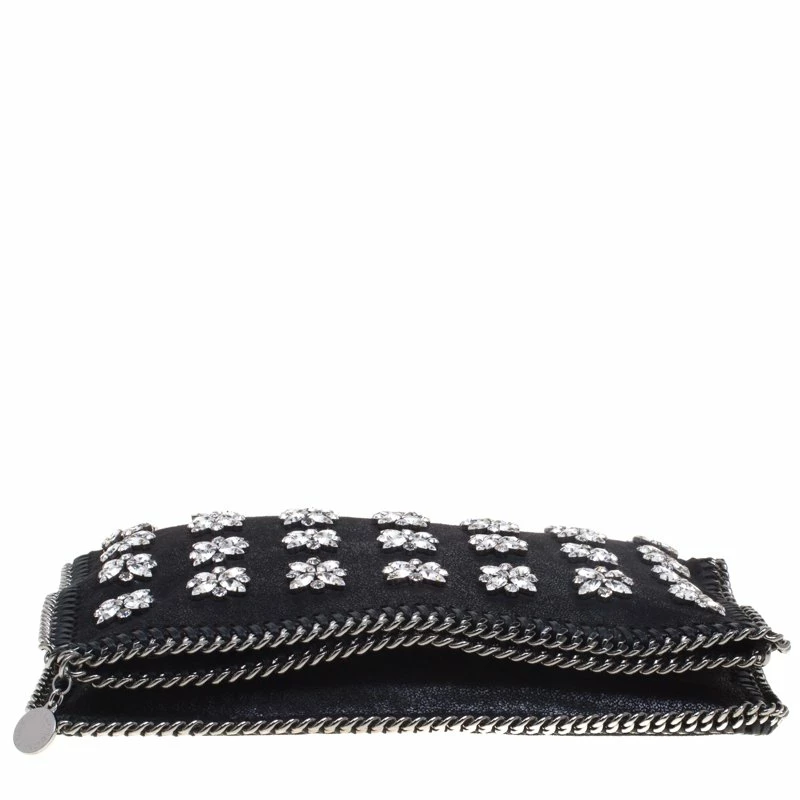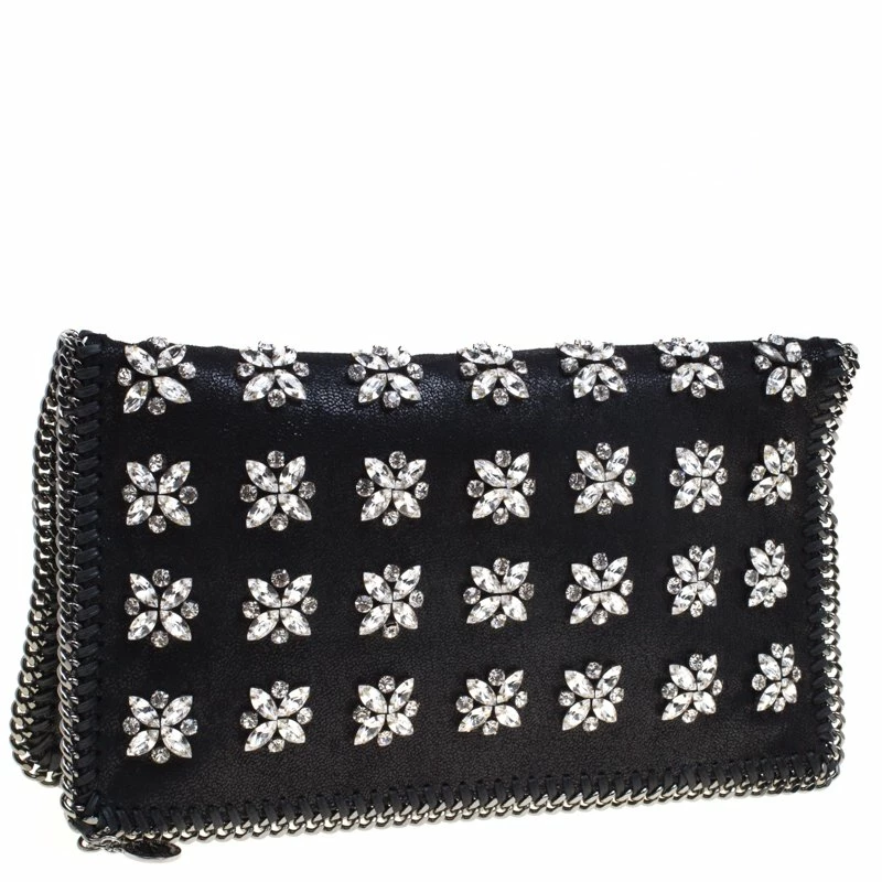 Stella McCartney is known for her classy designs and this chic foldover clutch perfectly embodies this trait. Crafted from faux leather with a fabric interior, this beauty has pretty crystal embellishments on the front and silver-tone chain details at its contours. It also features magnetic snap closure and a logo-engraved charm. This bag can be carried with formal dresses or party wear.