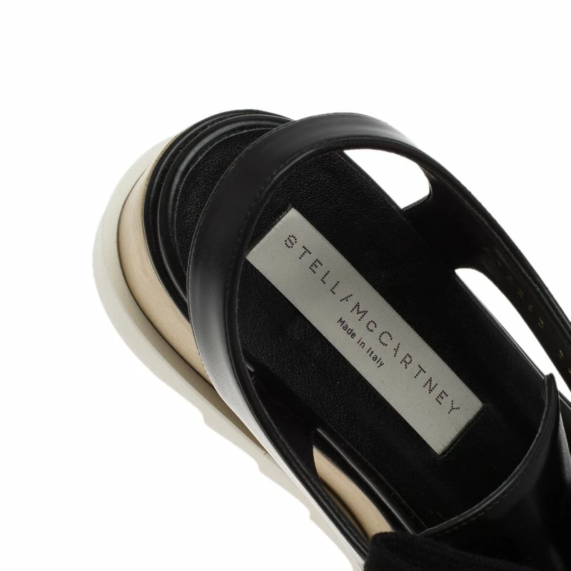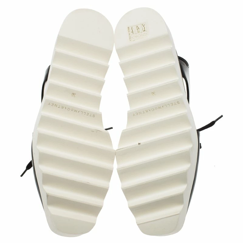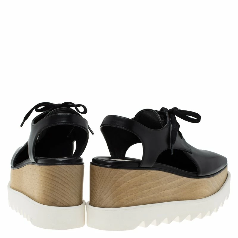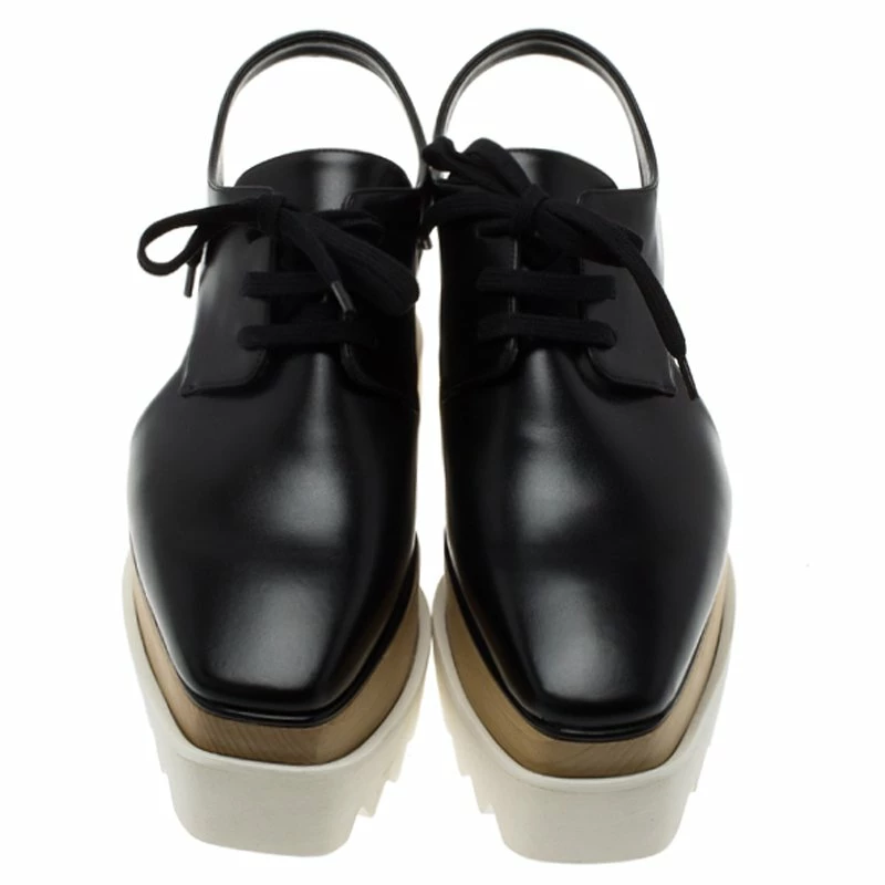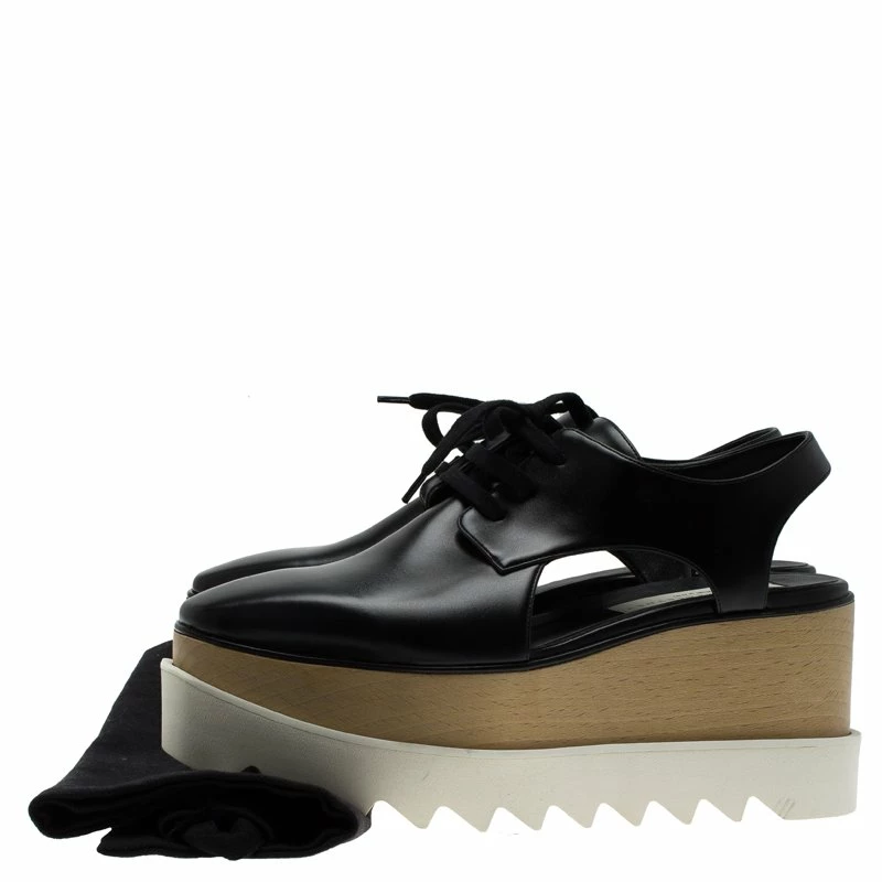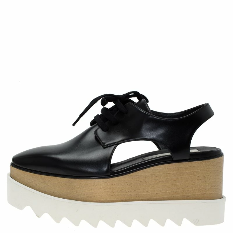 the Stella McCartney Derby is a perfect partner for weekend ensembles. Created with reference to the classic oxford-style, this pair is designed with stacked wooden platform sole and finished with the signature brogue platform. Styled in smooth black faux leather, the front lace tie-ups and cut out detailing makes this a stand-out piece.