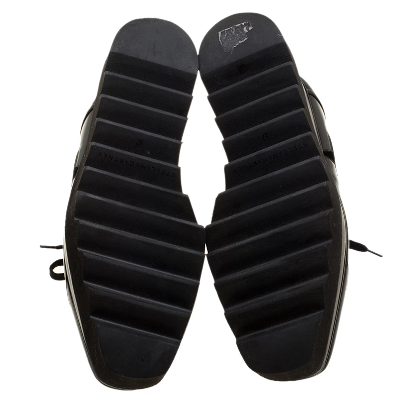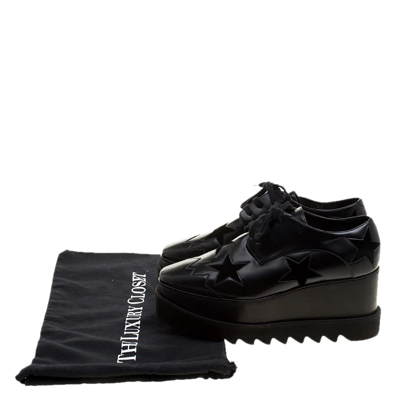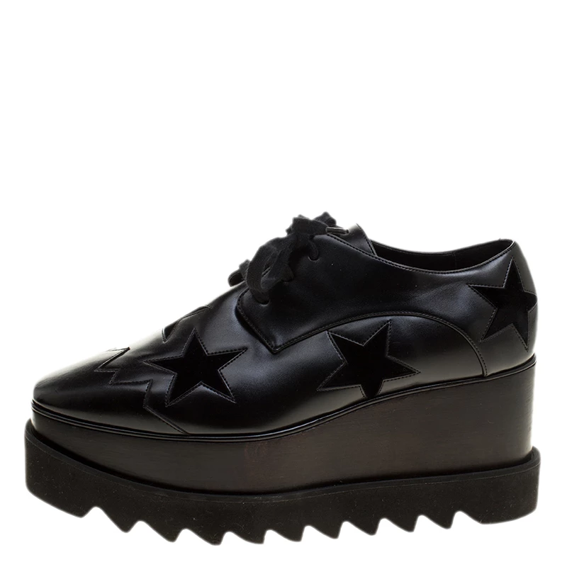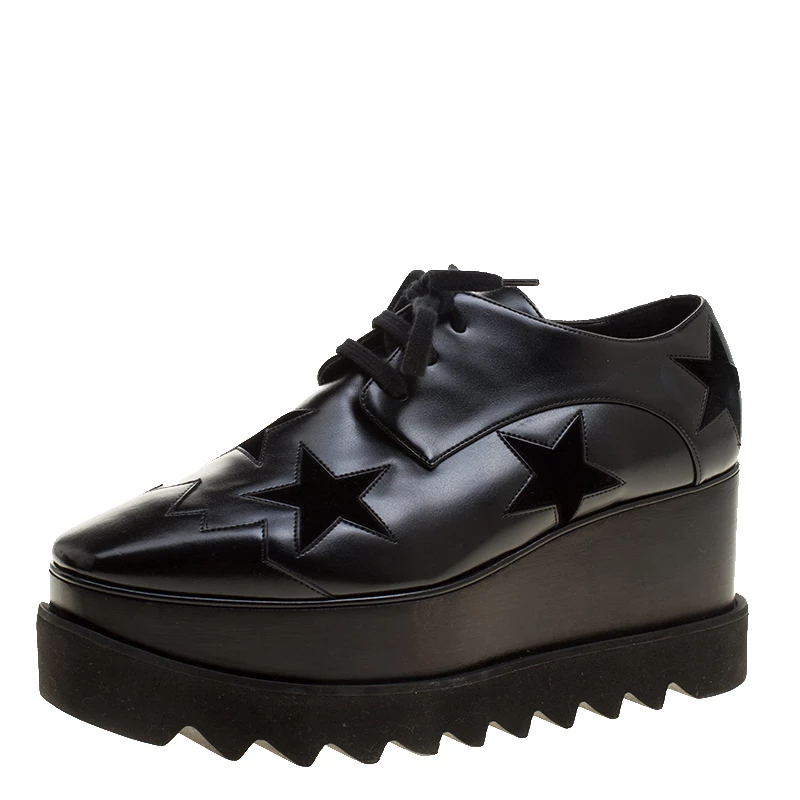 Jazz up your casual looks or add an edgy glam to your party outfits wearing these stunning Stella McCartney Elyse Star Derby shoes. Crafted in black faux leather and accented with black suede star shaped patches, these shoes feature thick black platforms which keep your comfortable while you giving the height.