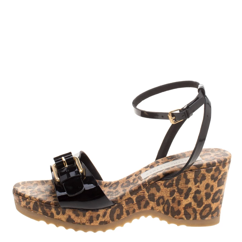 Stella McCartney is known for her chic designs and this pair of Linda wedges perfectly embodies this trait. Crafted from black faux leather, these cork wedge sandals feature a beautiful leopard print exterior. Styled with open toes, this pair comes with buckle ankle straps and gold tone buckle detailing on the vamps.