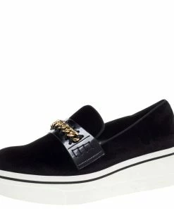 Wear it through the day or look effortlessly stylish and comfortable for the evenings out wearing these stunning Stella McCartney platform slip-on sneakers. With a black suede surface and eye-catching chain trim on the faux leather panel, these sneakers feature a white rubber sole that gives you height while looking extremely stylish.