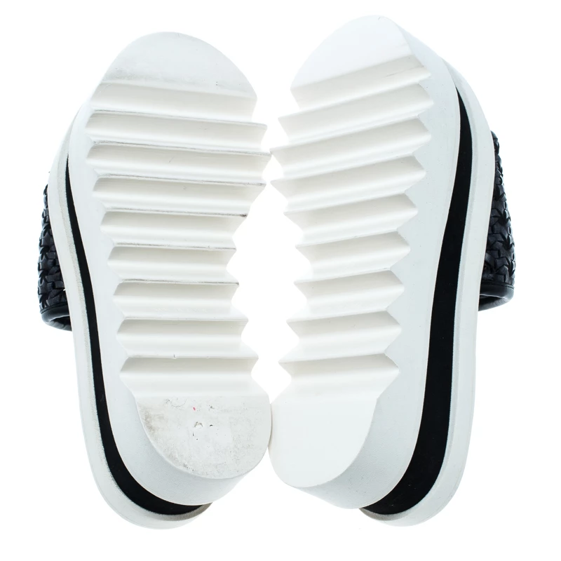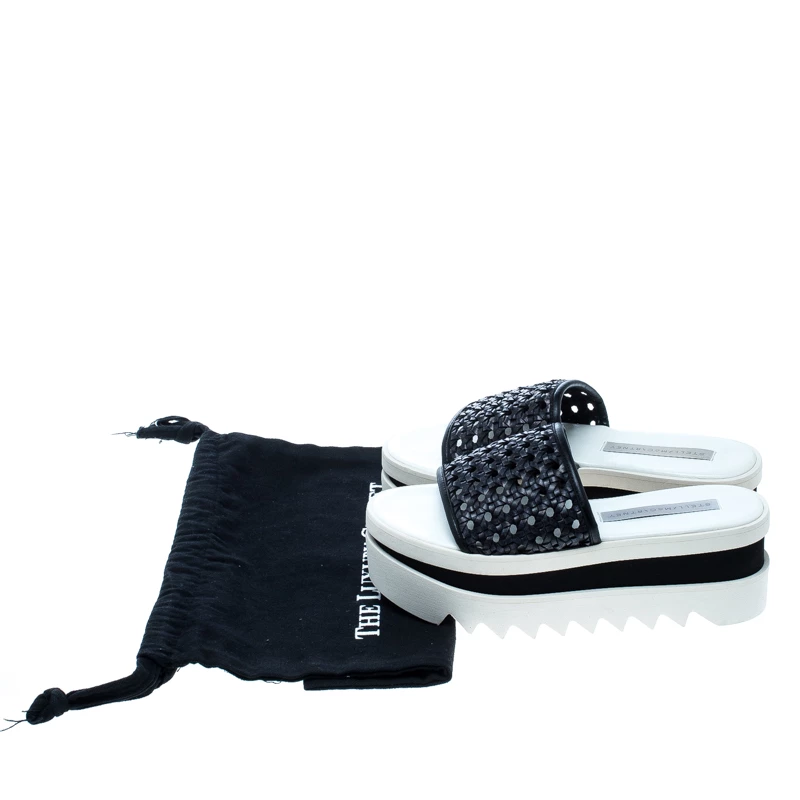 Grab these Stella McCartney slides and experience comfort like never before! The black slides are crafted from faux leather and feature an open toe silhouette. They flaunt perforated and woven vamp straps and are complete with 7 cm solid platforms.