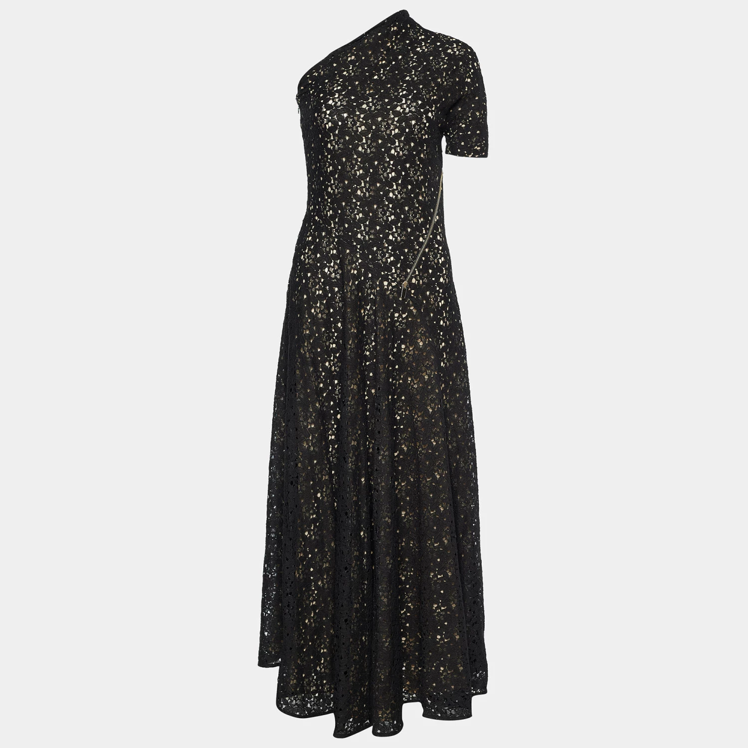 Bring elegance and poise to your appearance by wearing this maxi dress from the House of Stella McCartney. It is fashioned in black lace fabric into a stunning one-shoulder silhouette. It has a zipper for fastening. Style this maxi dress with stilettoes and look nothing but gorgeous.