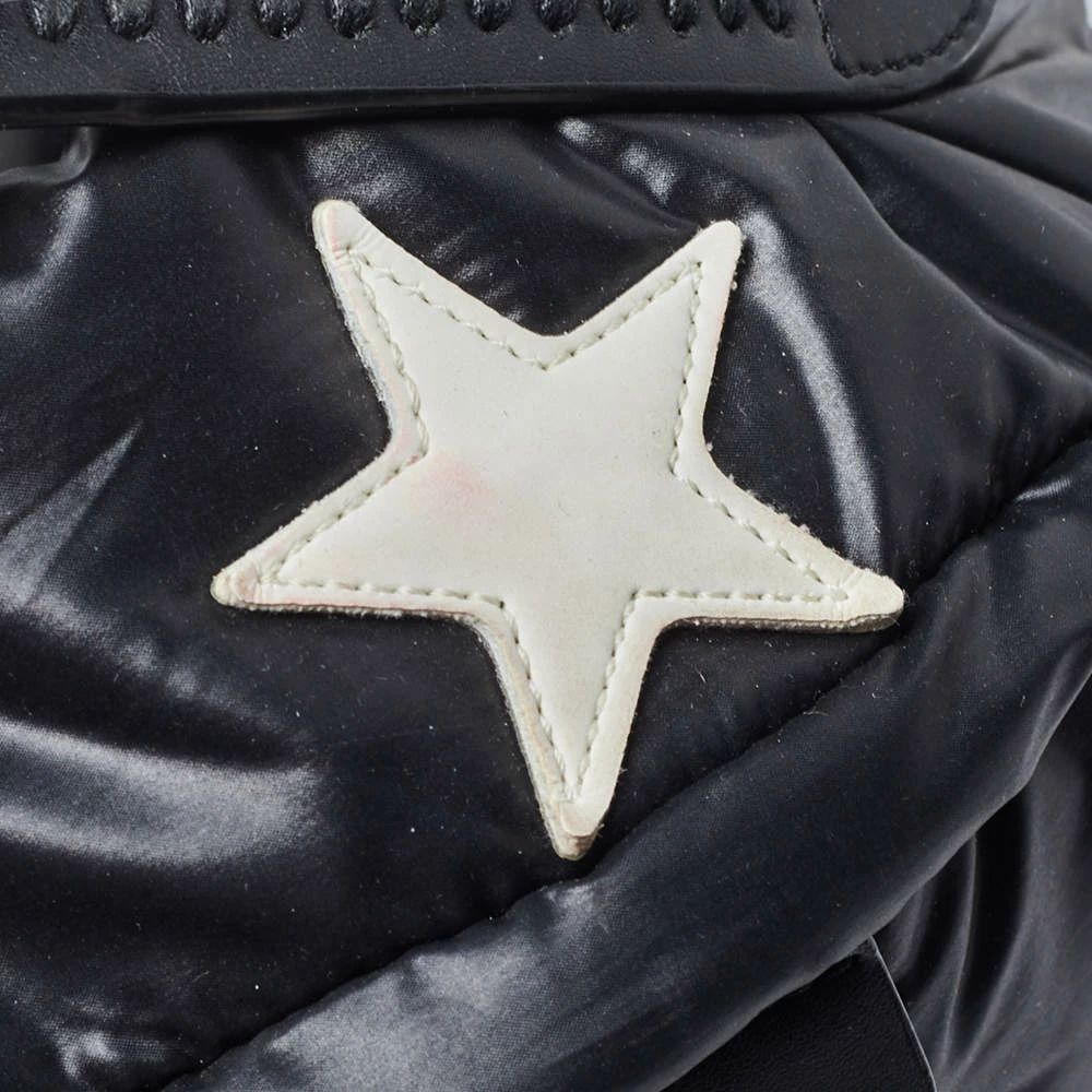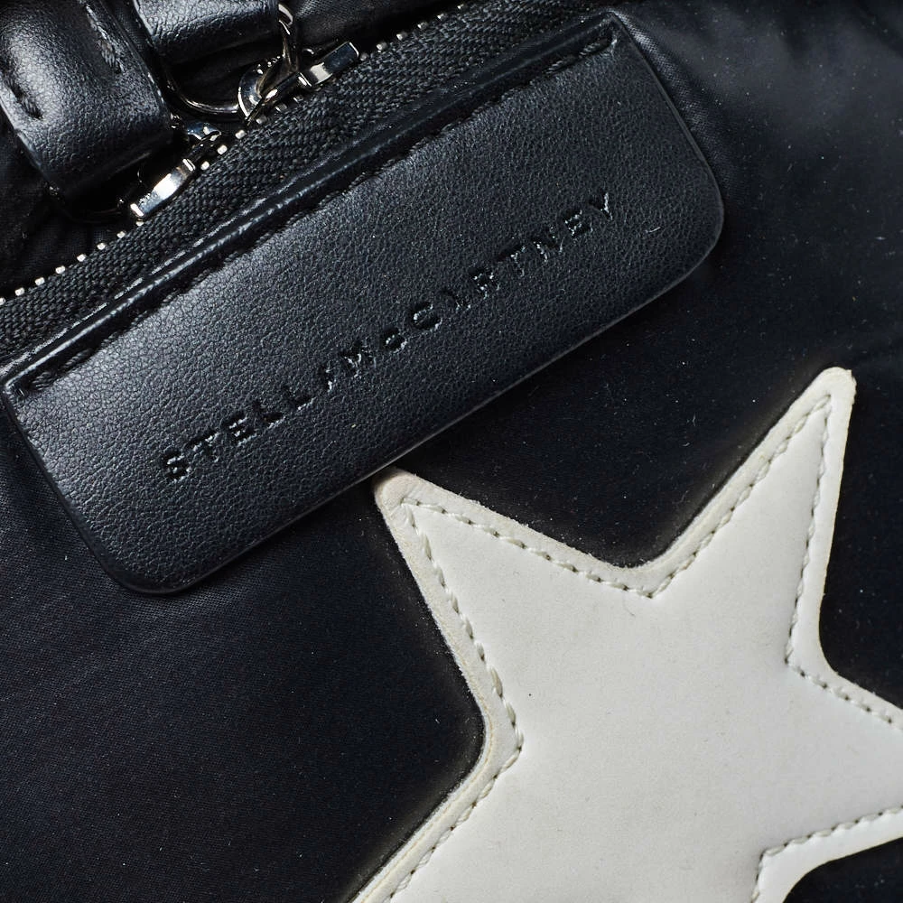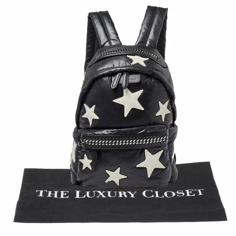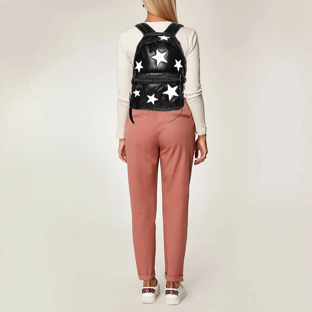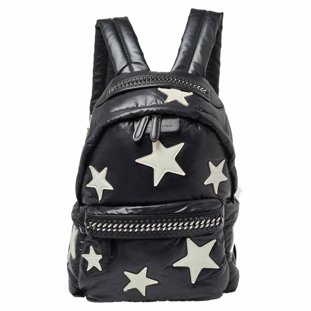 This Falabella backpack by Stella McCartney has been designed to deliver style and functionality. It has been crafted from black nylon and features star motifs. It features a main zip compartment, a front zip pocket, a durable nylon-lined interior with a zip pocket, and enough space to house your essentials. The bag is held by two backstraps and a small handle. It is finished with silver-tone hardware.