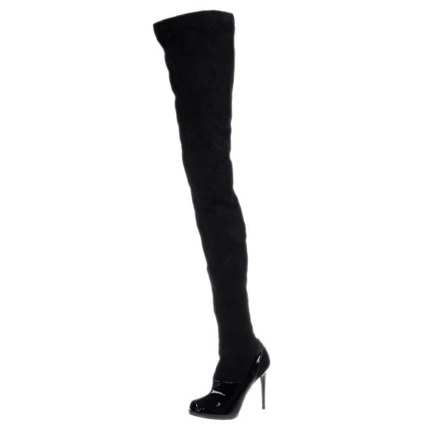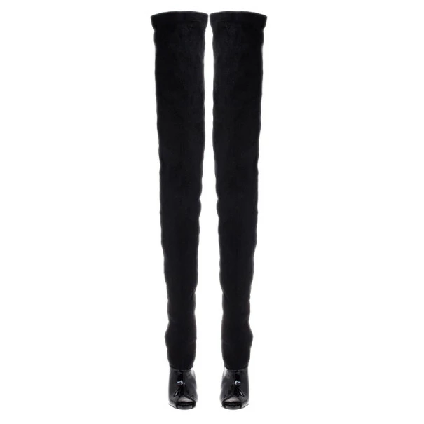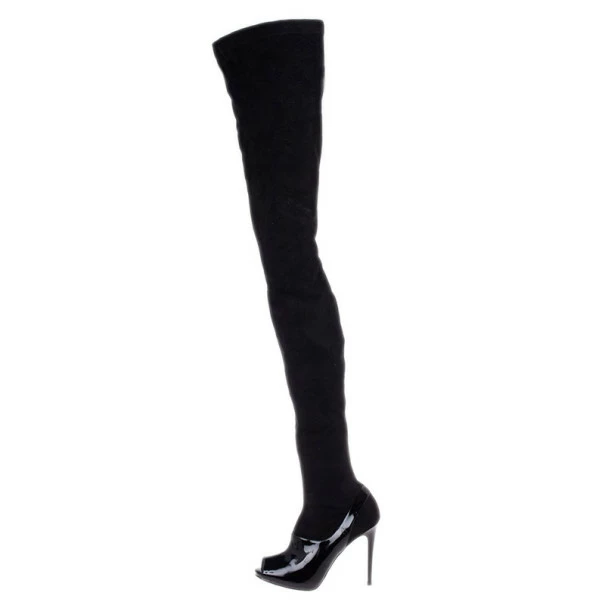 These Stella McCartney Over The Knee Boots are absolutely breathtaking! Crafted from black patent leather and suede, they feature peep toe caps, leather vamps and suede tops. Lined with leather, these fabulous boots carry Stella McCartney labeled insoles. Add these to your outfit for a super stylish look. Original Retail Price: US $1,075