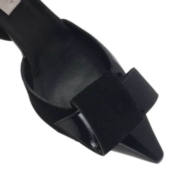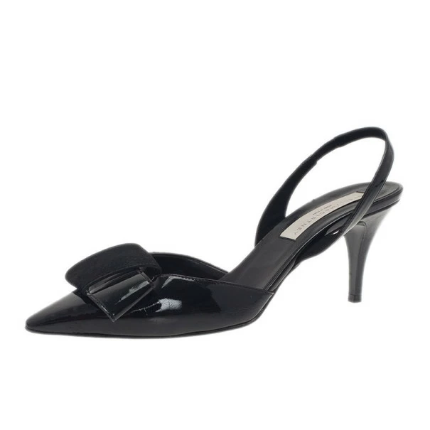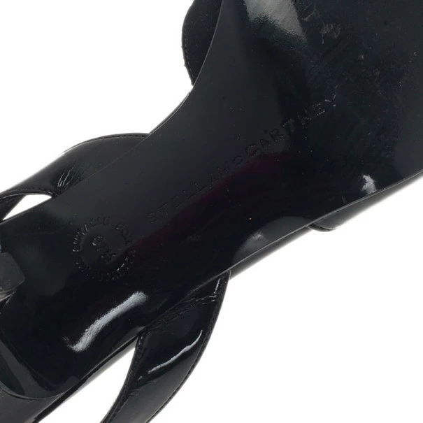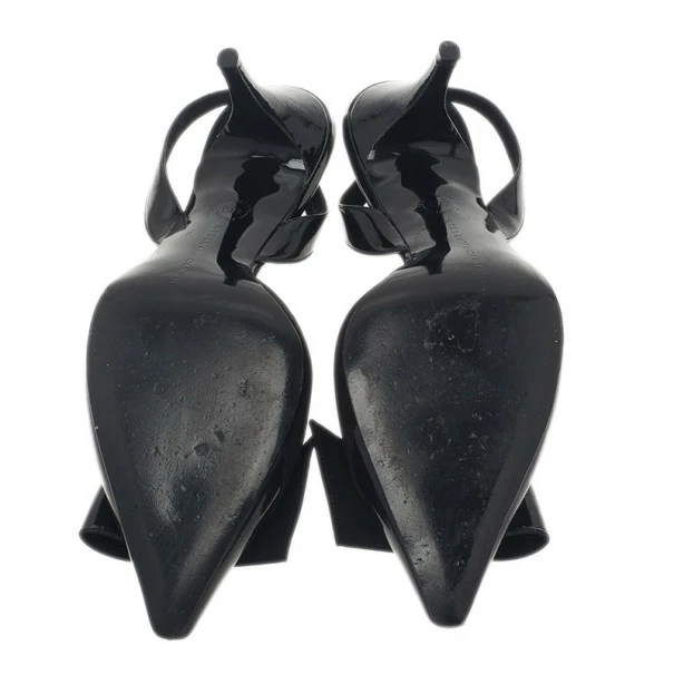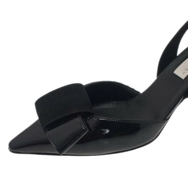 Make a classic fashion statement with these Stella McCartney black patent slingback sandals. They feature black glossy leather uppers with cute fold-over motifs on the front. The also feature pointed toes, and 7cm heels.