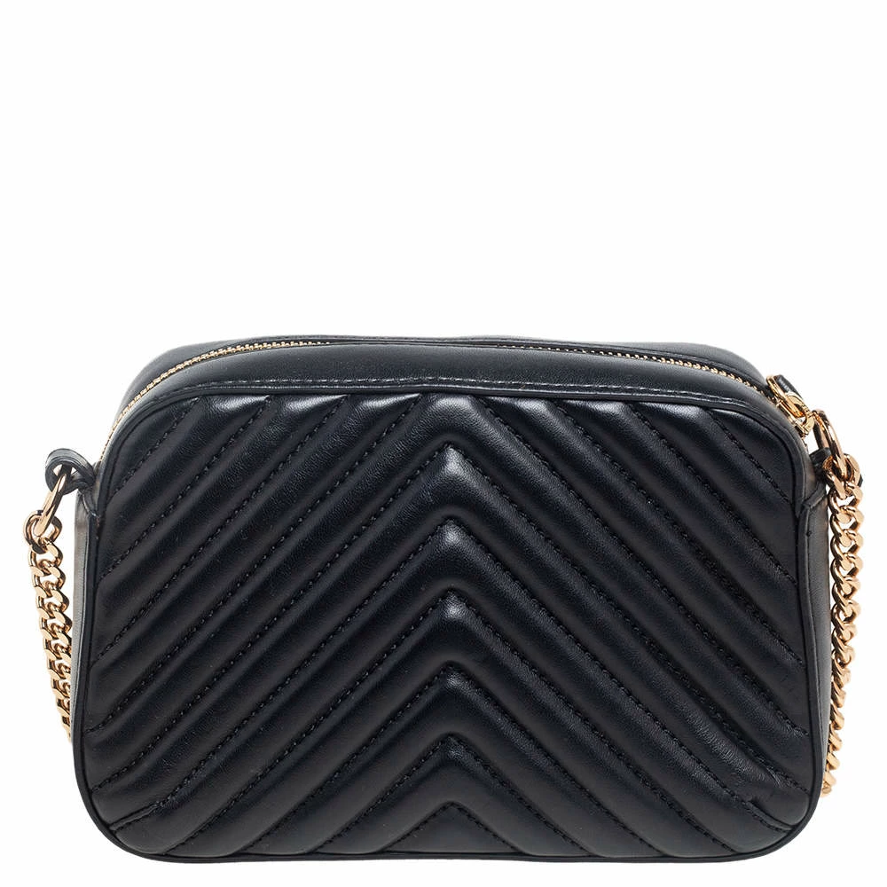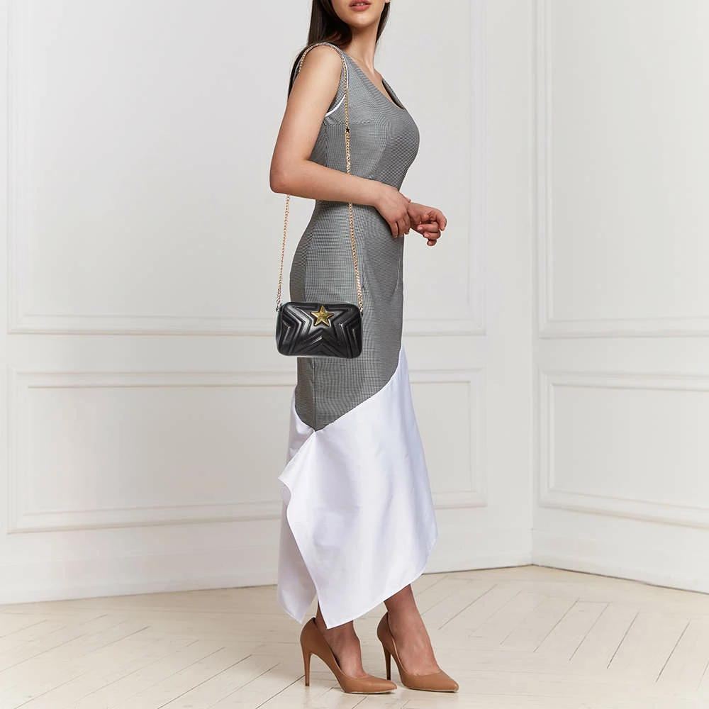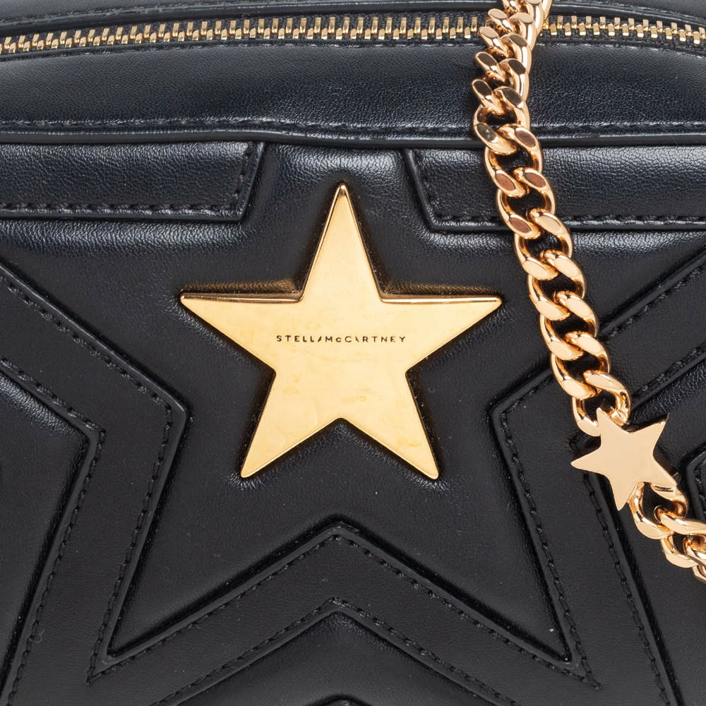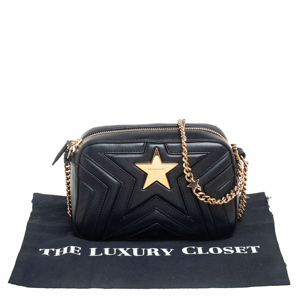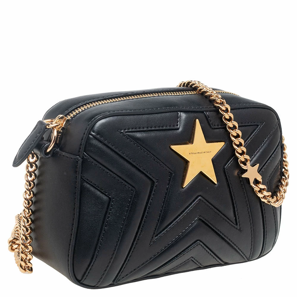 Coming from the House of Stella McCartney, this Stella Star crossbody bag will help your style sparkle! It is made from black quilted faux leather on the exterior and comes with a gold-toned star motif embellishment on the front. It has a faux suede-lined interior and a sturdy chain strap.