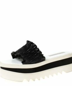 Lovely to look at and comfortable to wear, these slides from Stella McCartney definitely need to be on your wishlist. These slides are crafted from faux leather and feature an open toe silhouette. They flaunt ruffled vamp straps and high platforms.