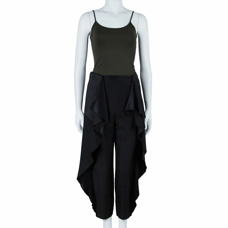 Ease into autumnal bliss with these femininely understated pants by Stella McCartney. Rendered in airy lightweight rayon, this black pair adds flounce to your steps with its side ruffles and drape overlay, making this an effortlessly breezy piece for the autumn winter edit. It also features a flat waistband, left snap button fastening and two on-seam side pockets.