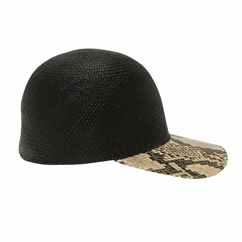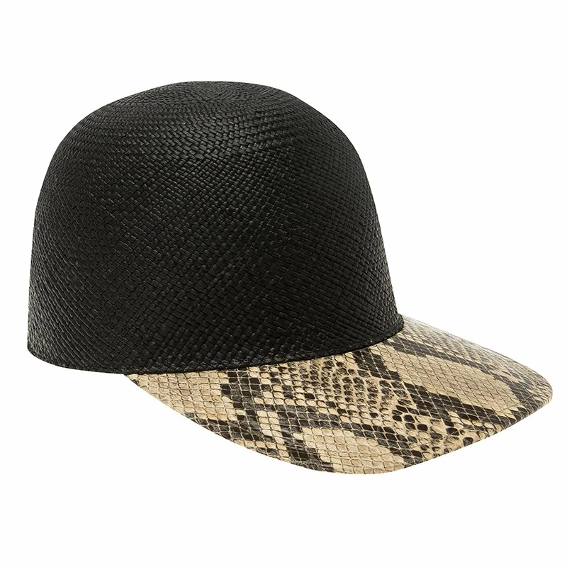 This black straw and faux python baseball cap from the luxury brand, Stella McCartney, is functional and sustainable. It is tailored with the signature style of the brand and is very feminine. It is fashionable and gives the humble baseball cap a twist. The athletic cap exudes luxury in every way.