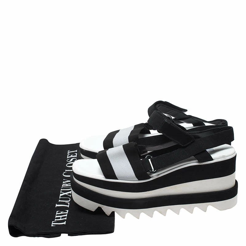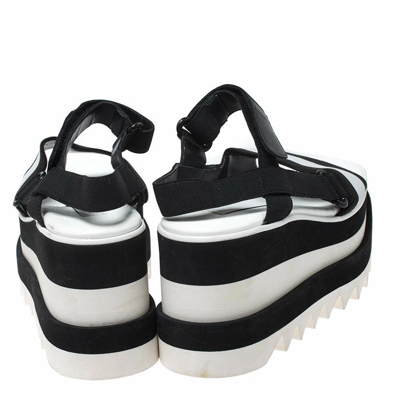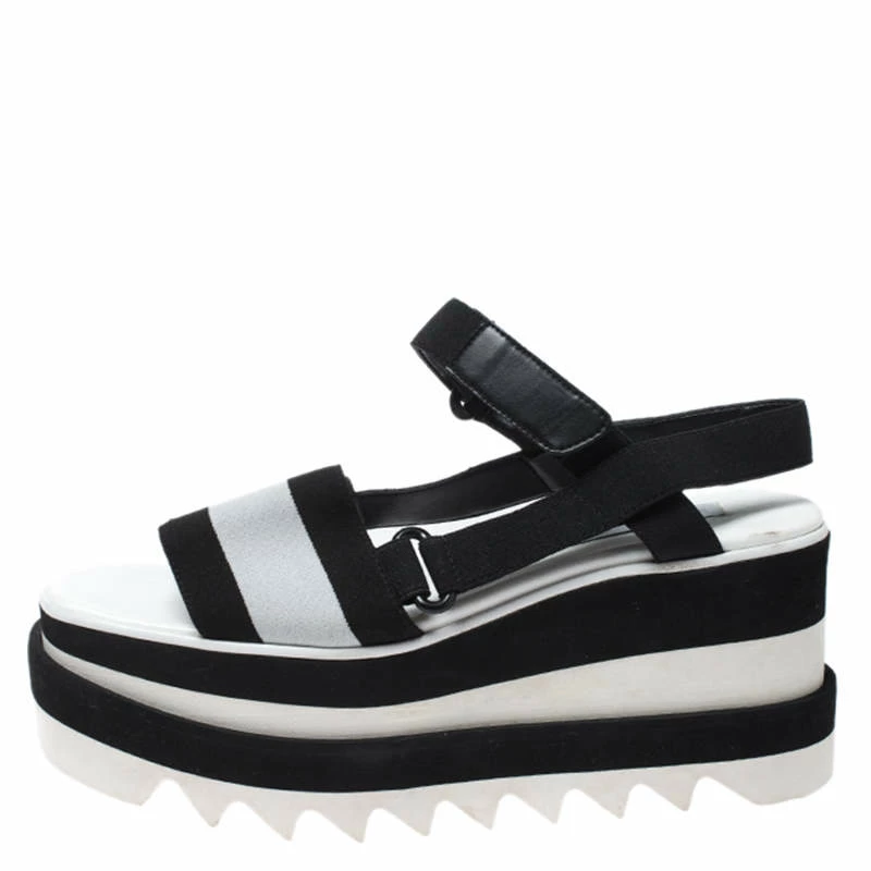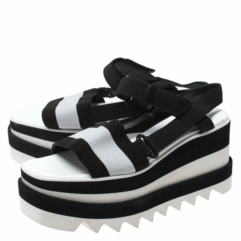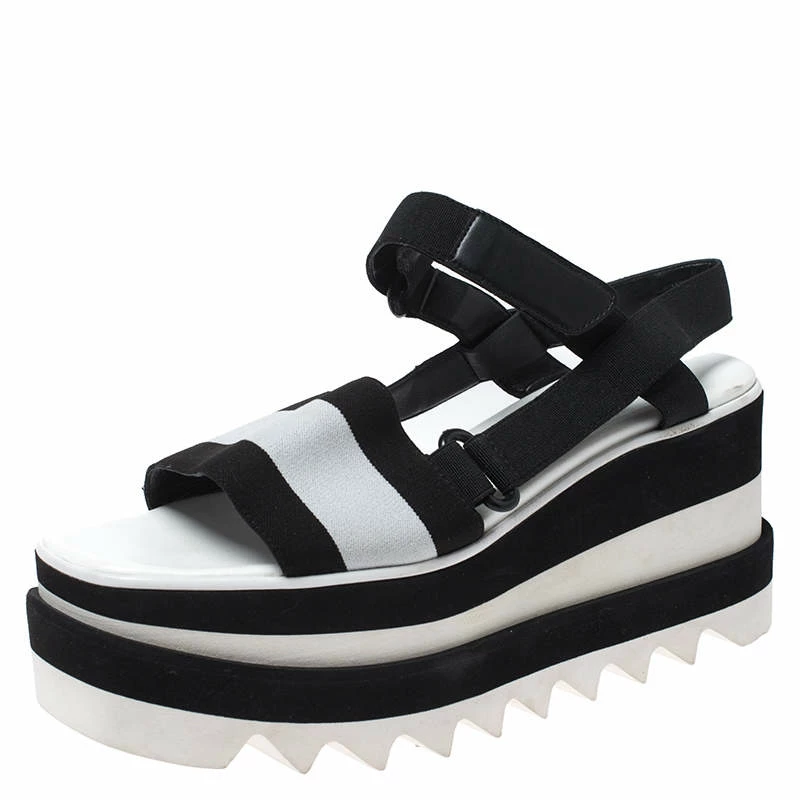Stella McCartney is one of the leading names when it comes to a pair of gorgeous sandals like this one. Keep your style as comfortable as it can be with these sandals. Crafted from fabric, leather and rubber, they come in black & white hues. They have open toes, velcro straps for support, platforms and 8 cm heels. They are finished with black-tone hardware, leather lining and durable soles.