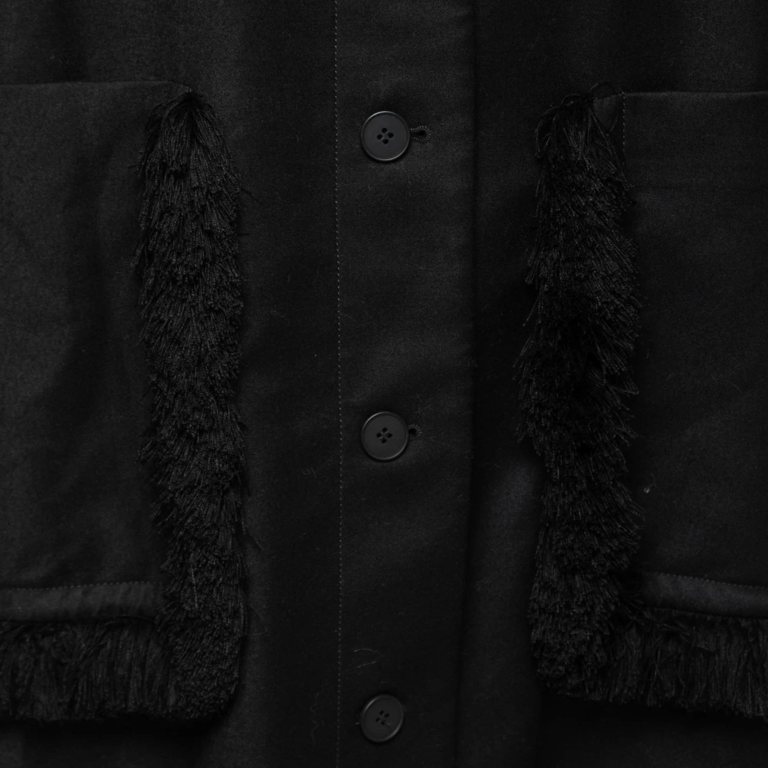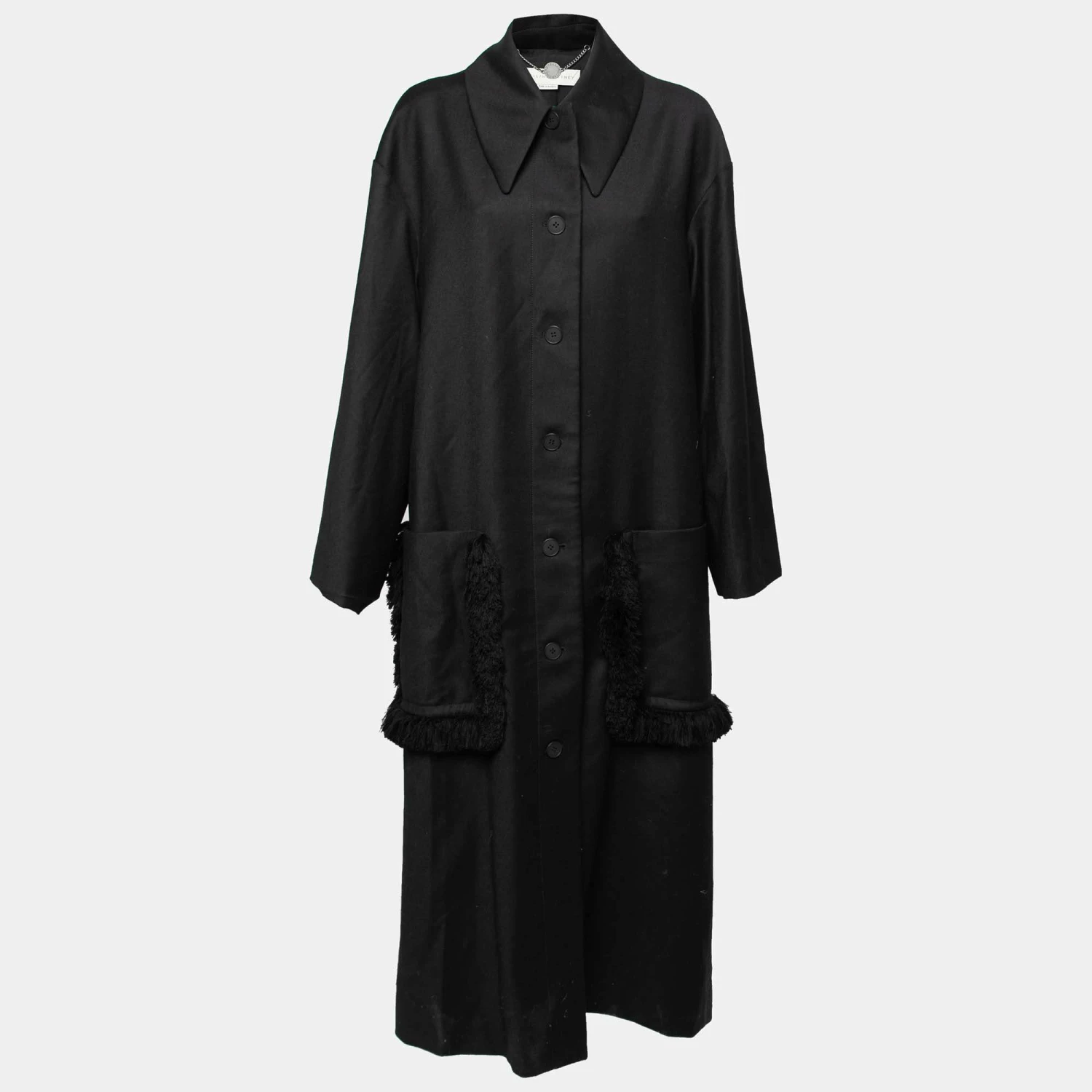 Be one step ahead in your fashion game with this Stella McCartney long coat. This black piece will make a stylish add-on to any outfit. It is designed with pockets having wool fringe trims and front buttons that add the perfect finishing element to this chic coat.