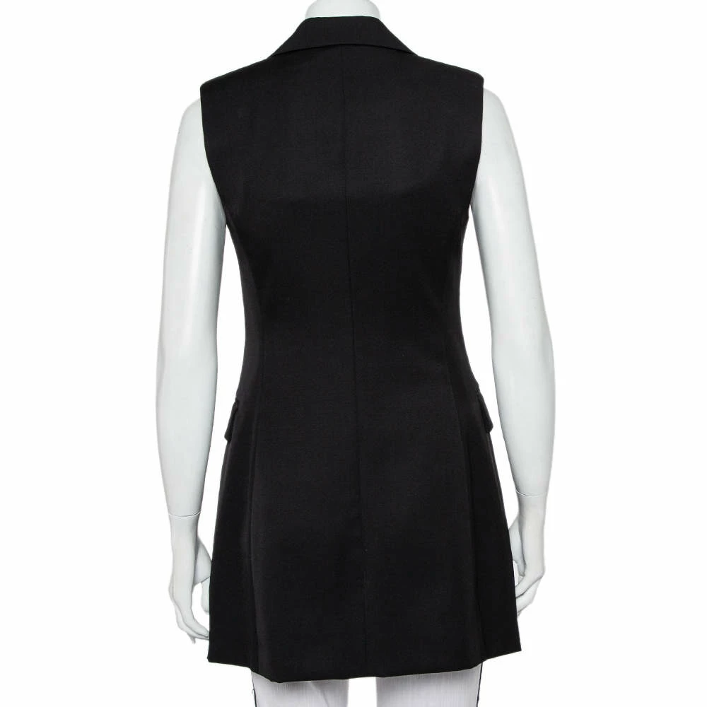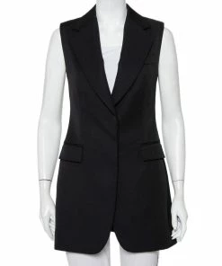 You’ll love wearing this long blazer jacket by Stella McCartney with simple casuals. It is made from wool and designed with a button front. The sleeveless black jacket is stylish and comfortable.