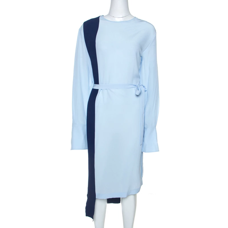 This stunning dress from the house of Stella McCartney is a must-have. Crafted from luxurious silk, it comes in a lovely shade of blue. It has a color block detail that adds interest. It comes with long sleeves, a round neck, a belt detail, button closure and a good fit. Pair with heels to deliver a polished look.