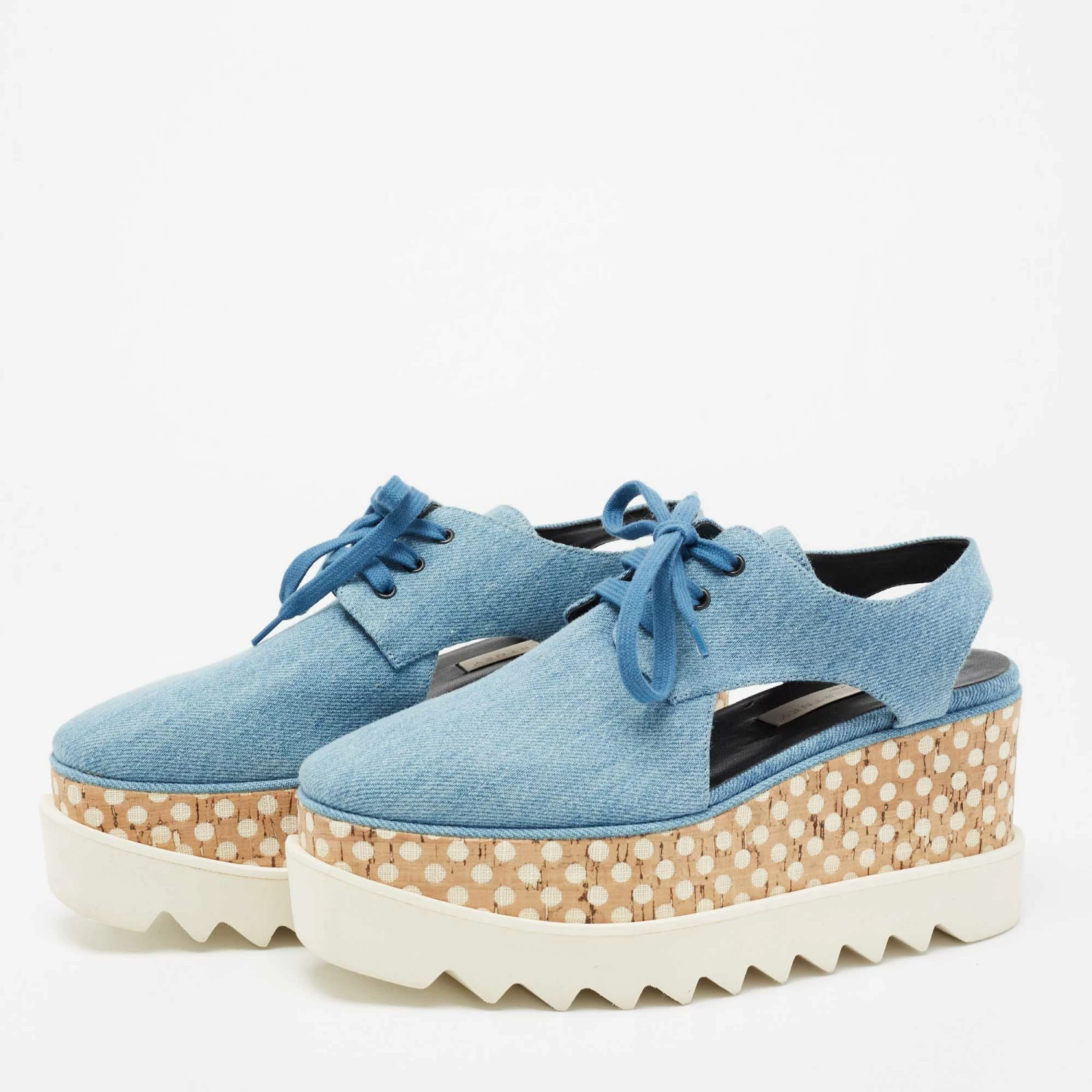 The unique silhouette of this pair of Stella McCartney derby makes it highly fashionable and chic. Constructed from denim, it is made striking with attractive cutouts and flaunts platforms, rubber soles, lace-up vamps, and 8cm heels.