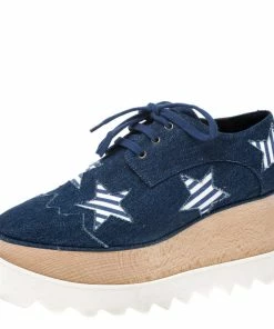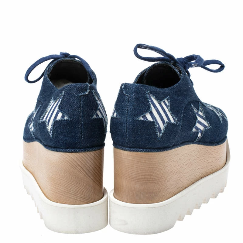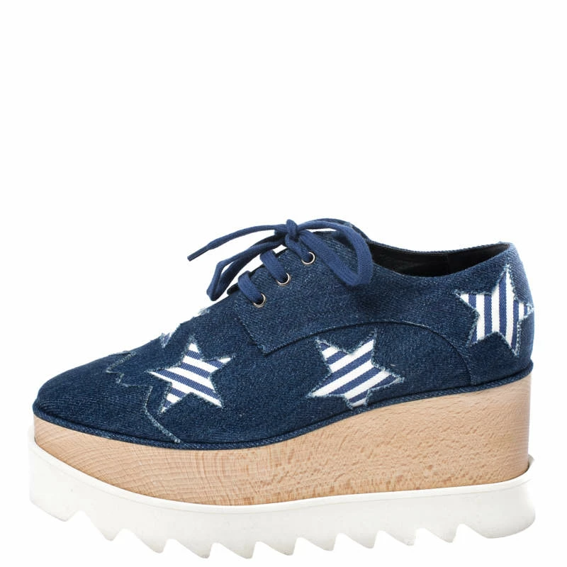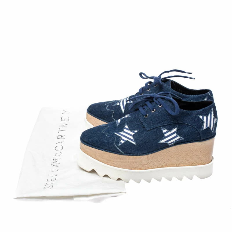 Stella McCartney exudes her high style and unique fashion taste with these Elyse Star derby shoes. They are brimming with exquisite details like the star details on the blue denim exterior, the lace-ups, 5.5 cm thick platforms and 8 cm wedge heels. Grab this pair today and let it help you express your fabulous style.