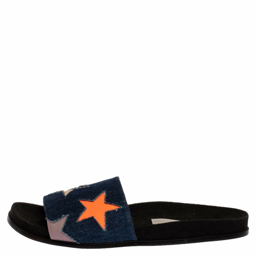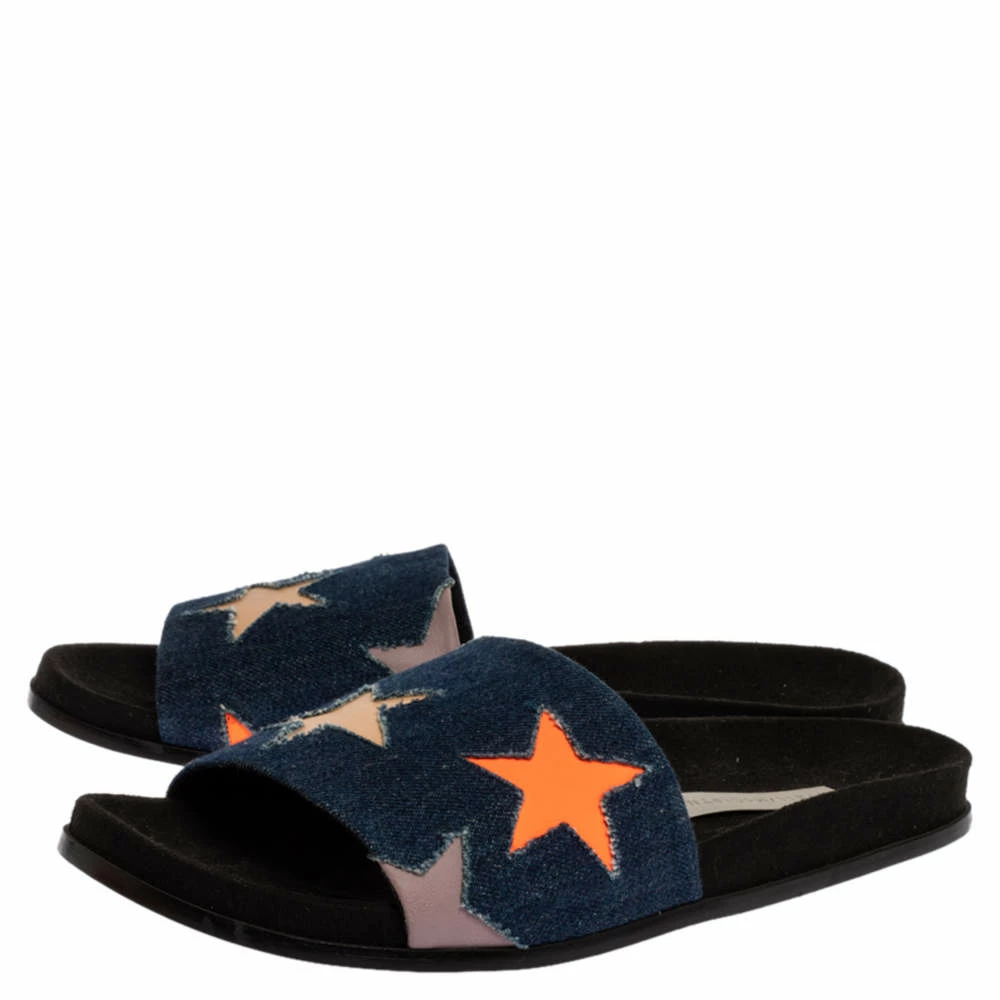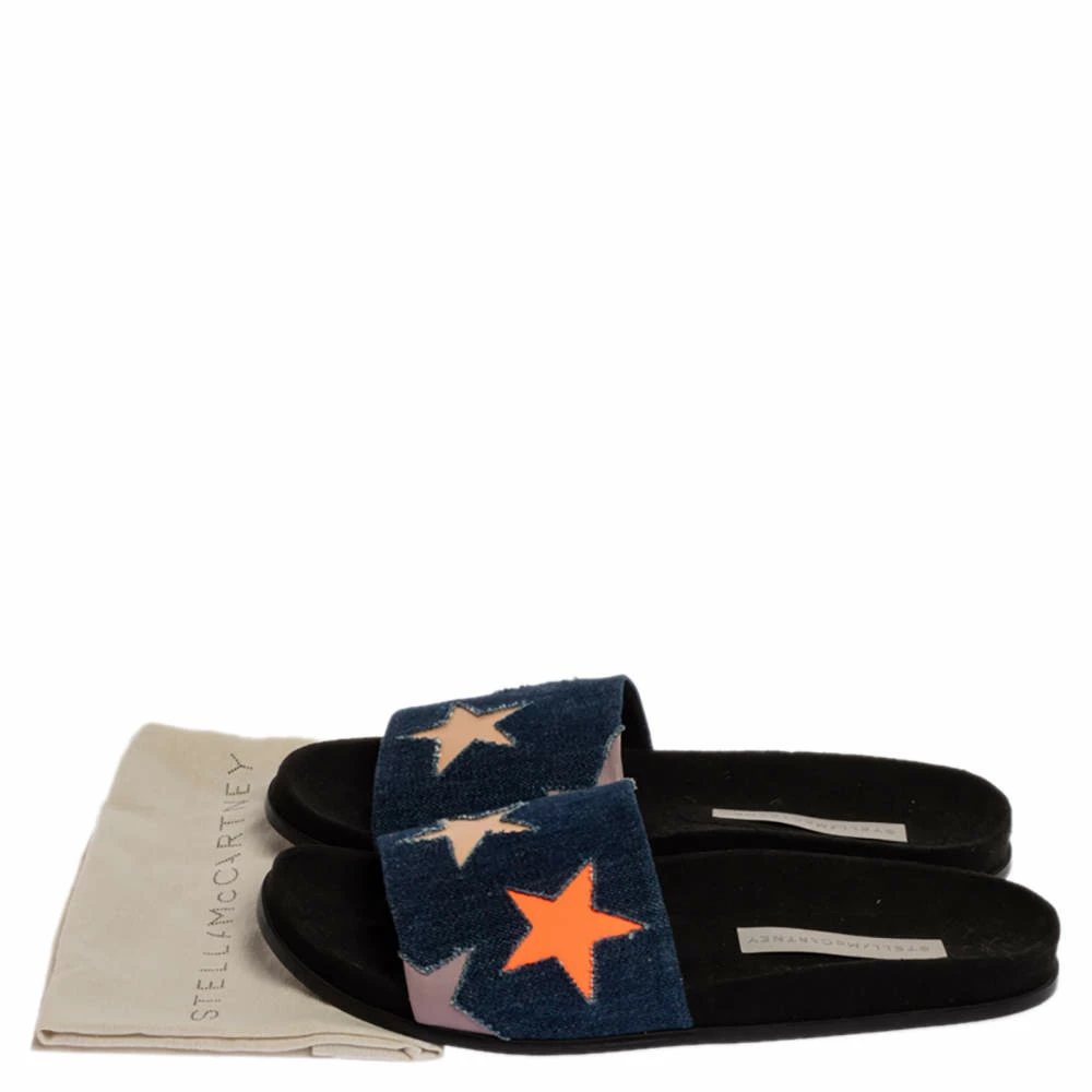 Comfort, luxury, and fashion come combined in these slides from Stella McCartney! They are designed with blue denim front straps detailed with stars and faux suede insoles for your ease. The slides are made for your casual style.