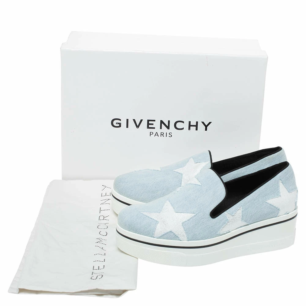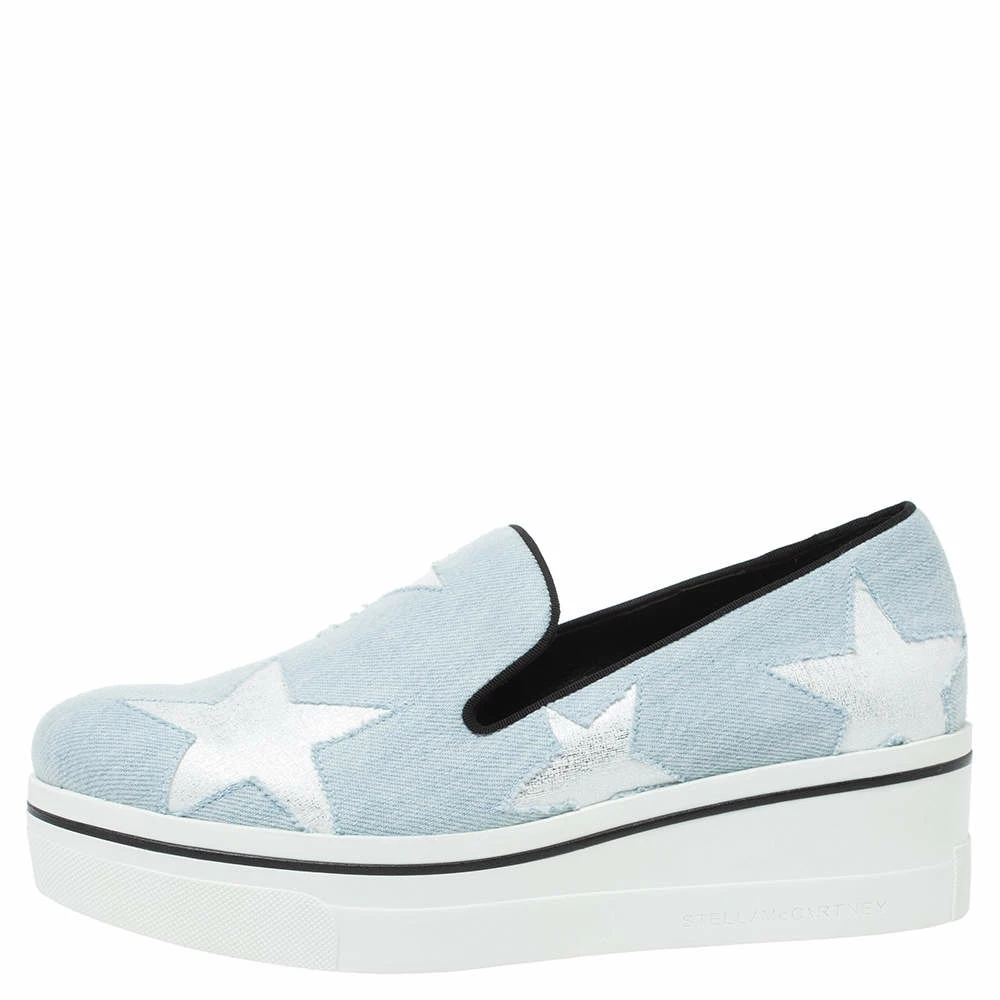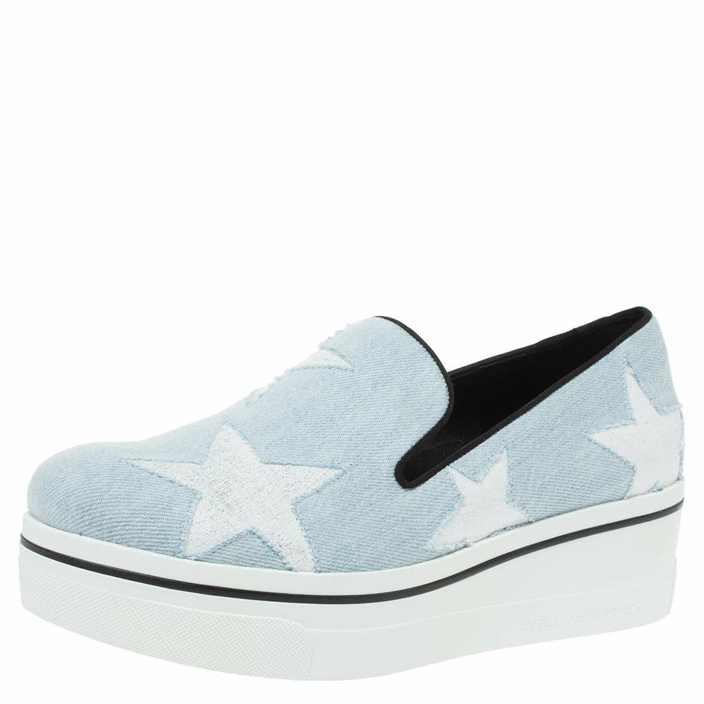 These blue Binx platform sneakers are popular for their style and comfort. The Stella McCartney shoes have been crafted with denim and they feature the signature star motifs all over the footwear. The trendy shoes are set on elevated platforms.
