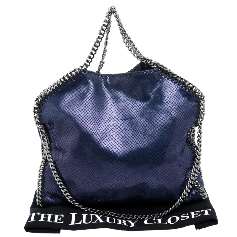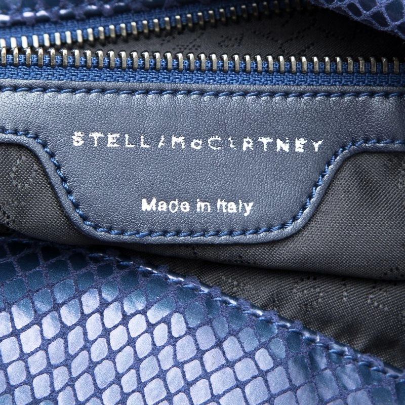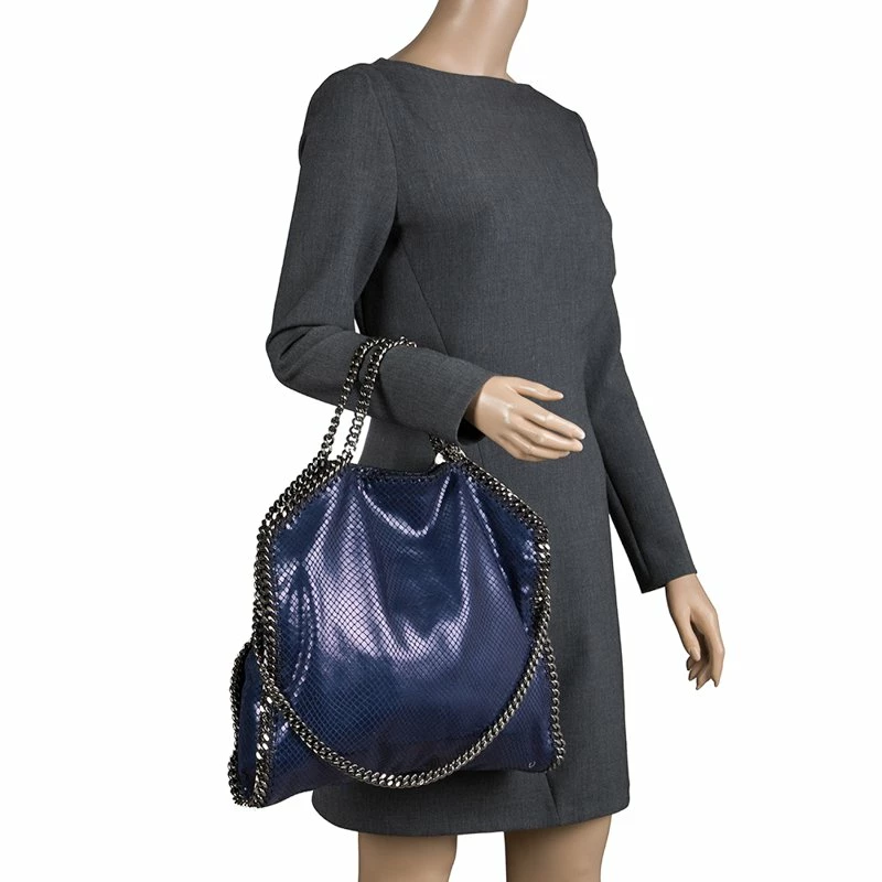 Stella McCartney is known for her feminine and sophisticated designs and this chic Falabella tote perfectly embodies this trait. Crafted from faux python with a fabric interior, this tote has a beautiful blue exterior and silver-tone chain details at its contours and as handles. It also features the signature logo engraved charm.