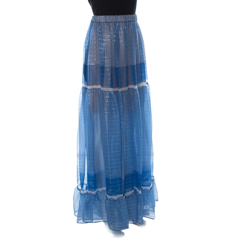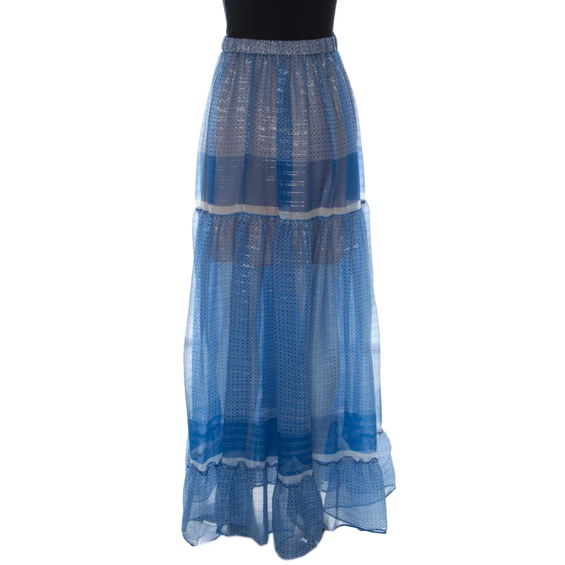 Gorgeous in blue, this skirt from Stella McCartney is sure to set hearts racing. The tiered skirt is made of a silk blend and features a beautiful print all over. It flaunts a maxi length. Complete the look with a feminine top, pencil heels, and an embellished cocktail ring for a fashionable evening.