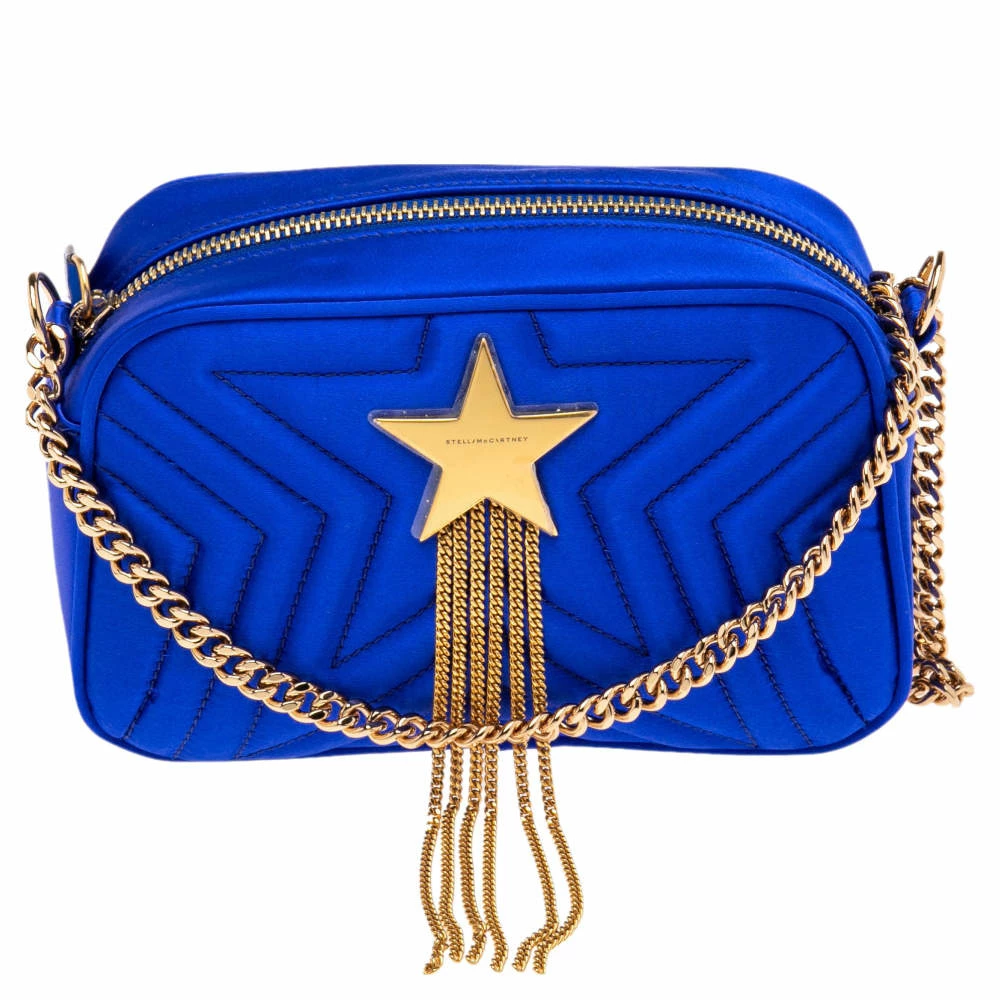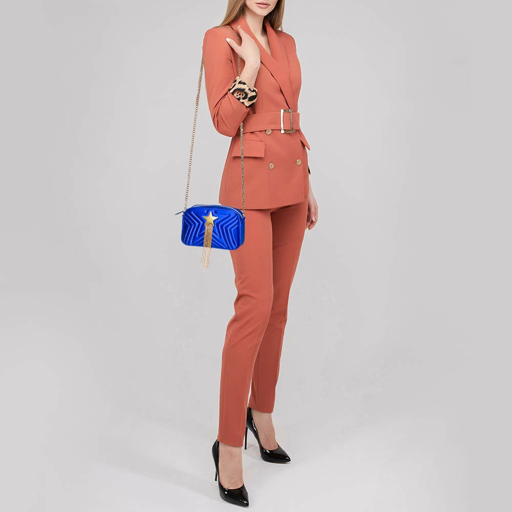 Make a wonderful appearance by adorning this plush bag by Stella McCartney. Crafted from satin, it comes in a lovely shade of blue. It features a quilted star pattern and the brand’s logo makes an appearance on a star-shaped emblem on the front flap. The faux suede-lined interior is sized to house your essentials. The bag is complete with a gold-tone chain-link strap.