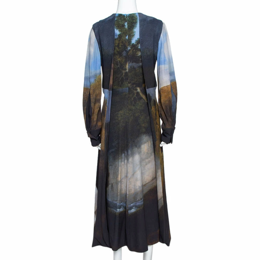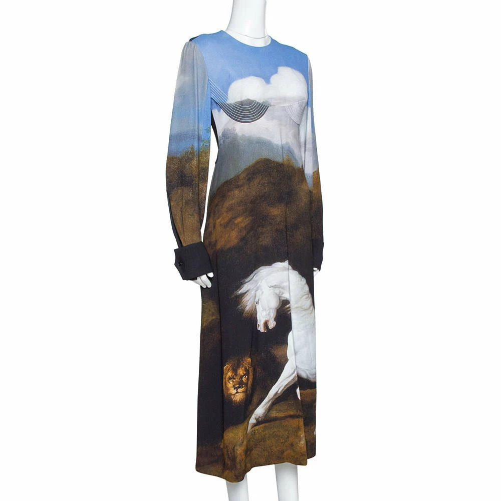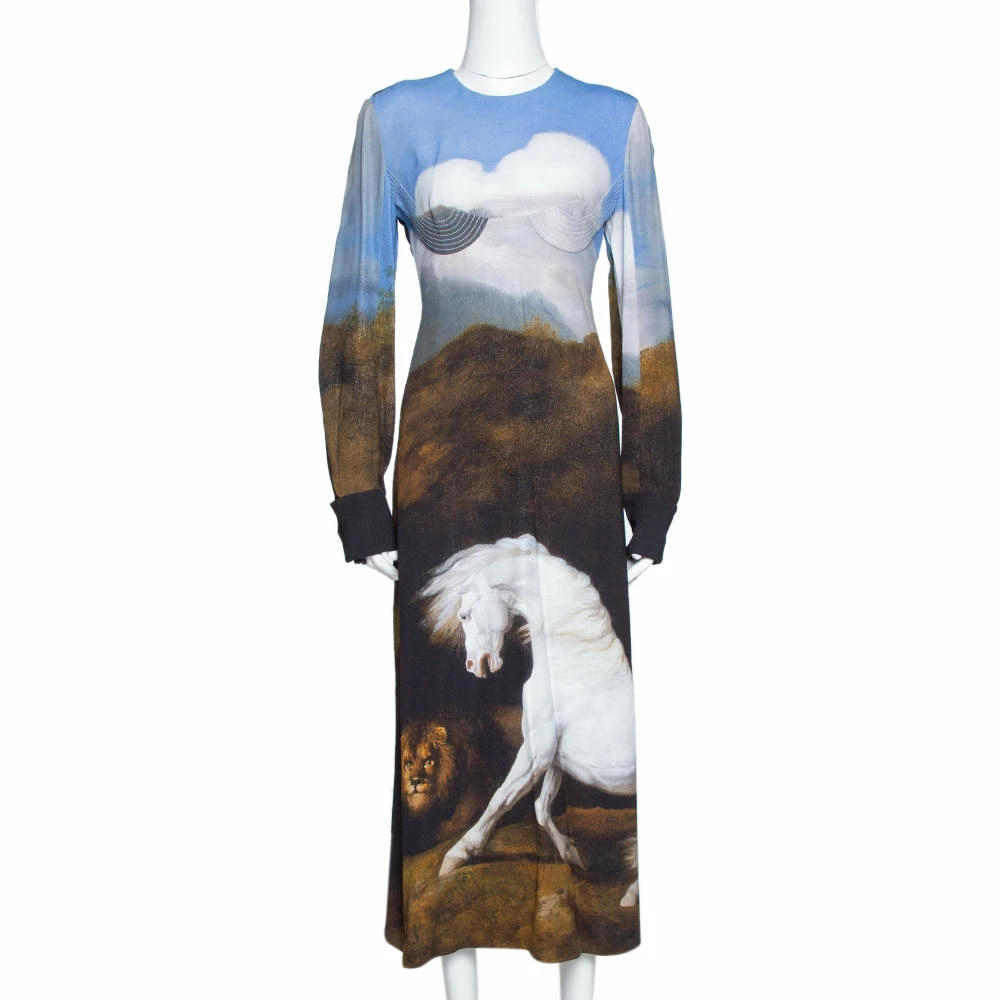 This Stella McCartney dress stands out beautifully. Style this elegant piece with dainty accessories for a unique and attractive look. Designed with a lovely horse print all over and a feminine midi silhouette with a side slit, the dress features long sleeves and zip closure at the rear.