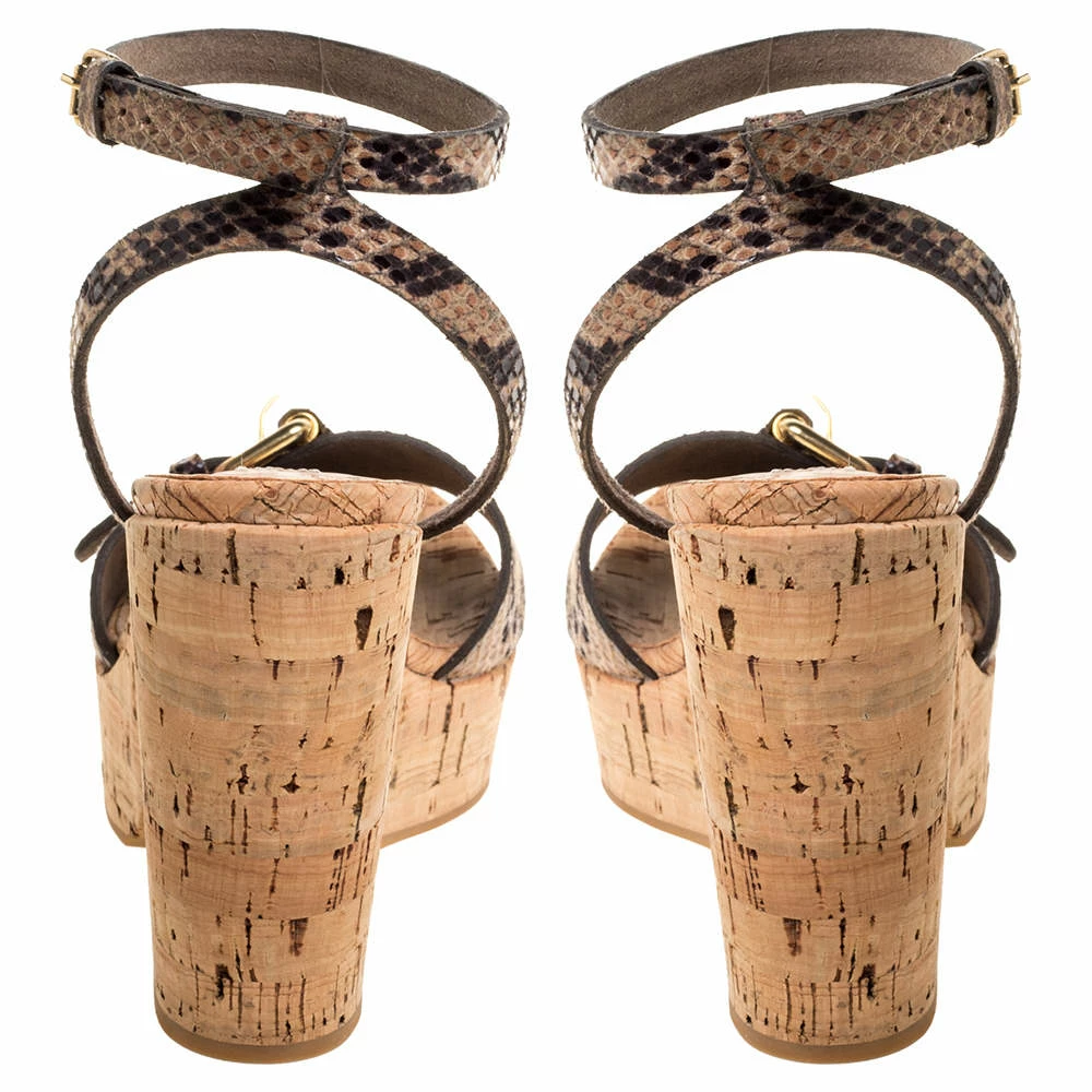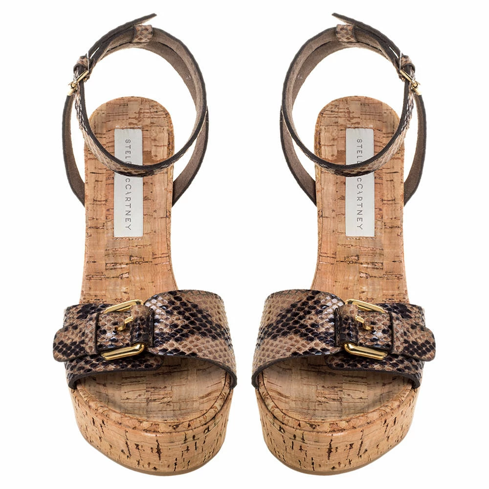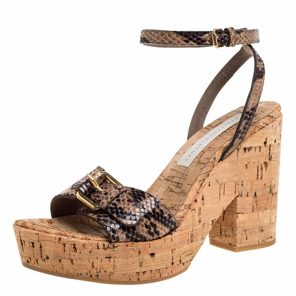 The house of Stella McCartney brings you these impressive sandals that will complement a host of outfits. They have been crafted from python-effect faux leather and come in lovely hues of brown & black. They are styled with open toes, buckle detailing on the uppers, buckled ankle straps, platforms and 10.5 cm cork heels.