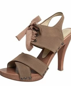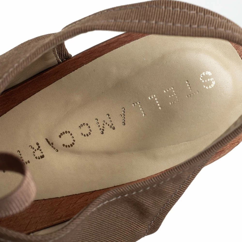 These stylish Stella McCartney sandals are crafted from brown-hued fabric and form a crisscross strappy design to form an open-toe style. They are adorned with laces and 10.5 cm high heels supported by platforms.