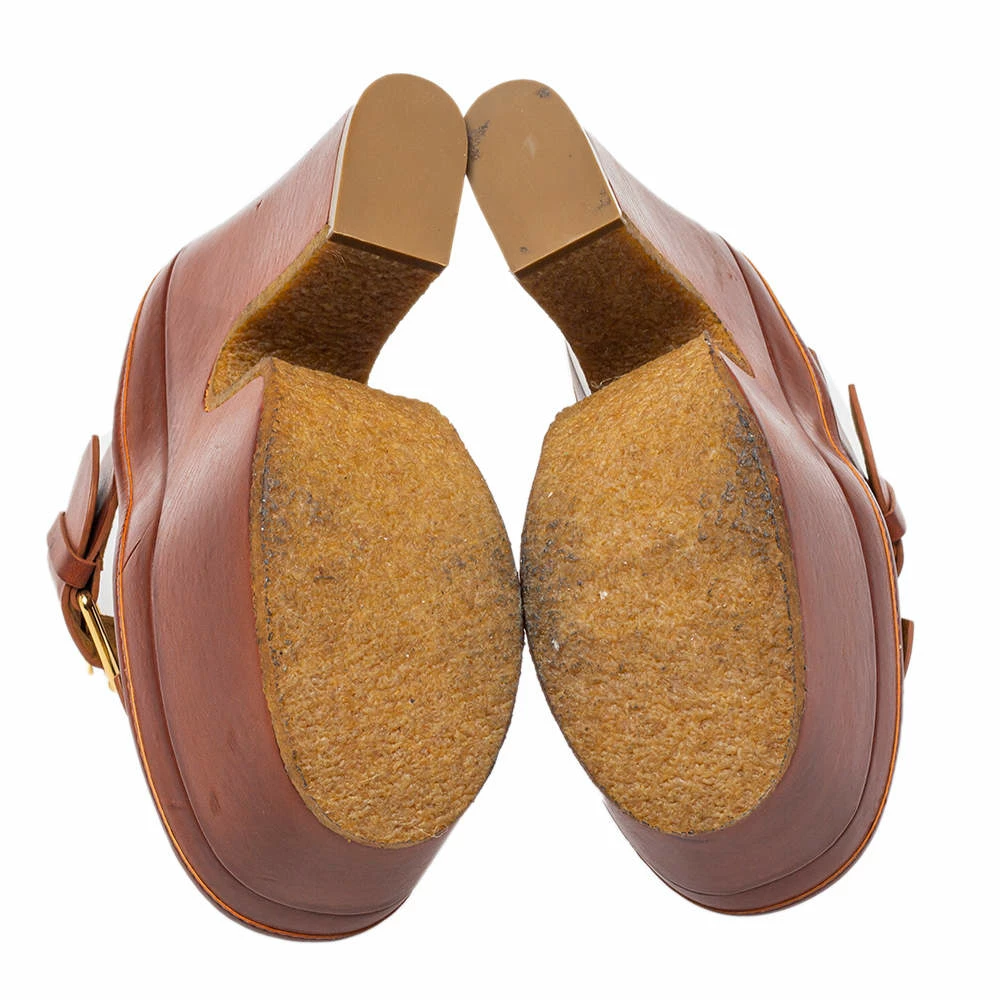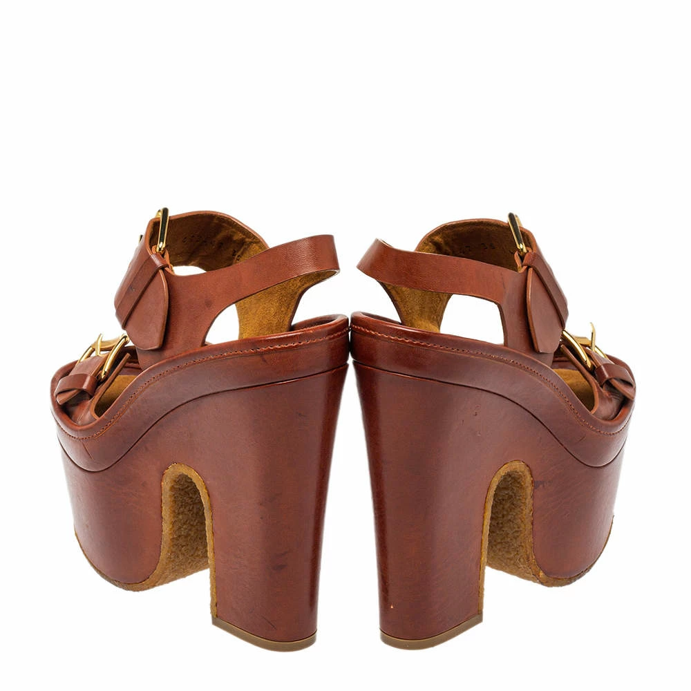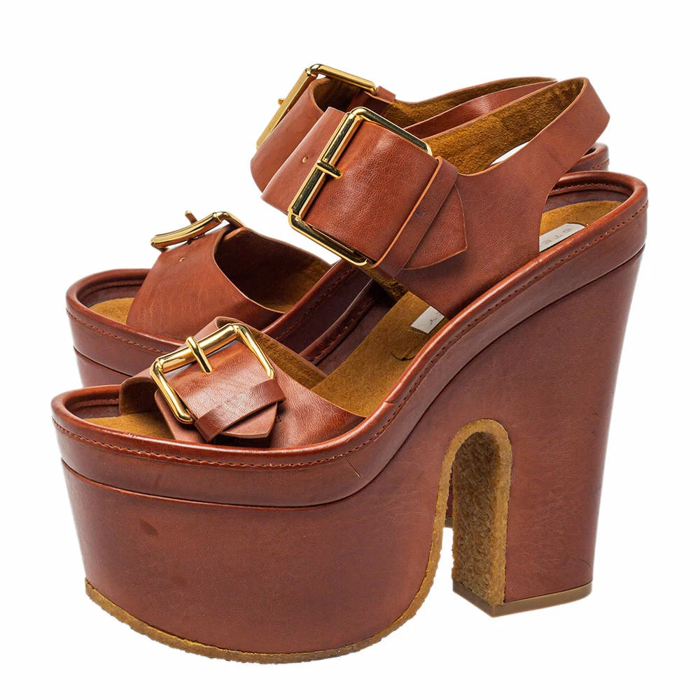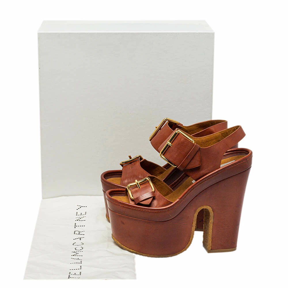 You are sure to feel your fashionable best every time you step out in these sandals from Stella McCartney! Beautifully designed using faux leather, they successfully present a statement appeal. The brown pair carries open toes, ankle fastening, platforms, and block heels.