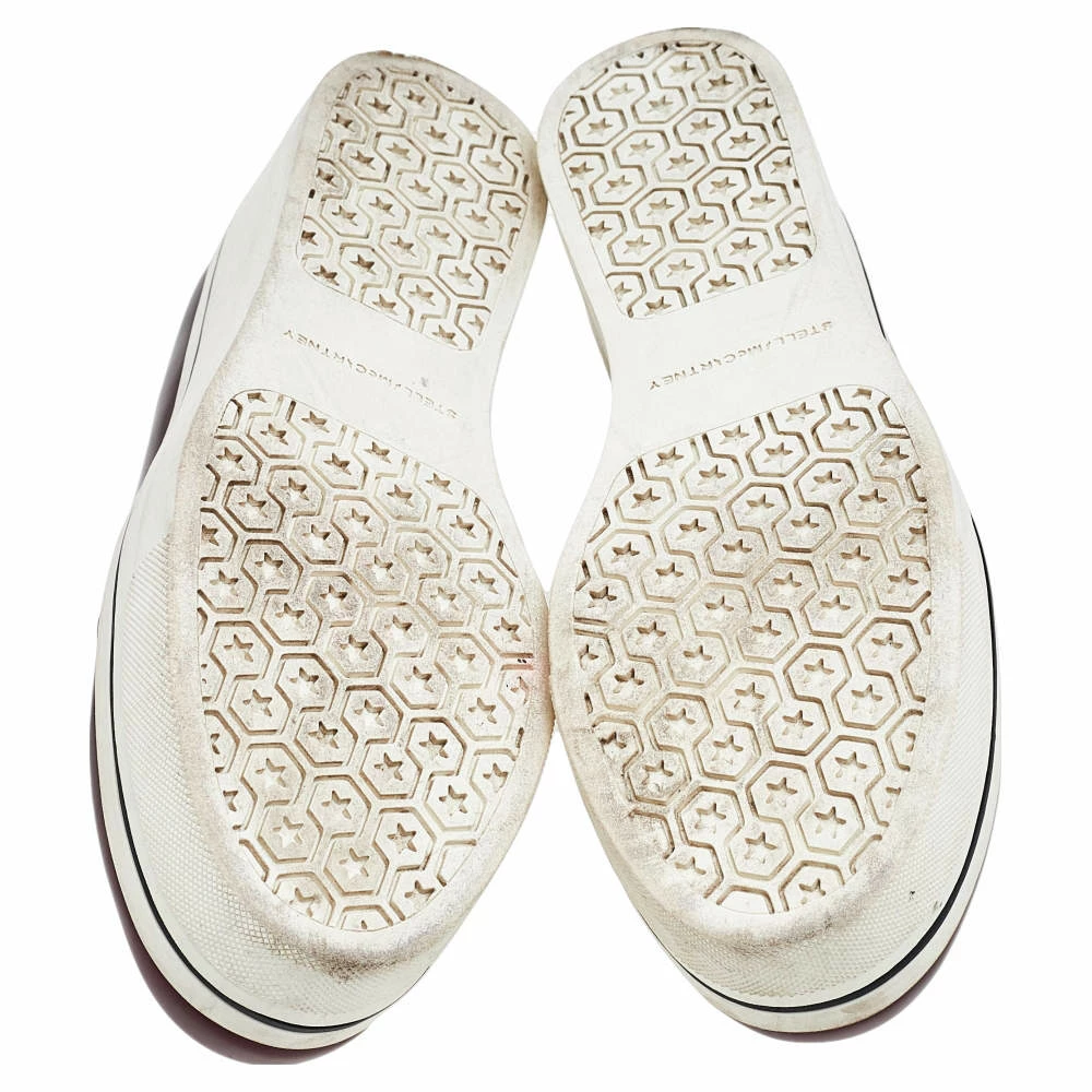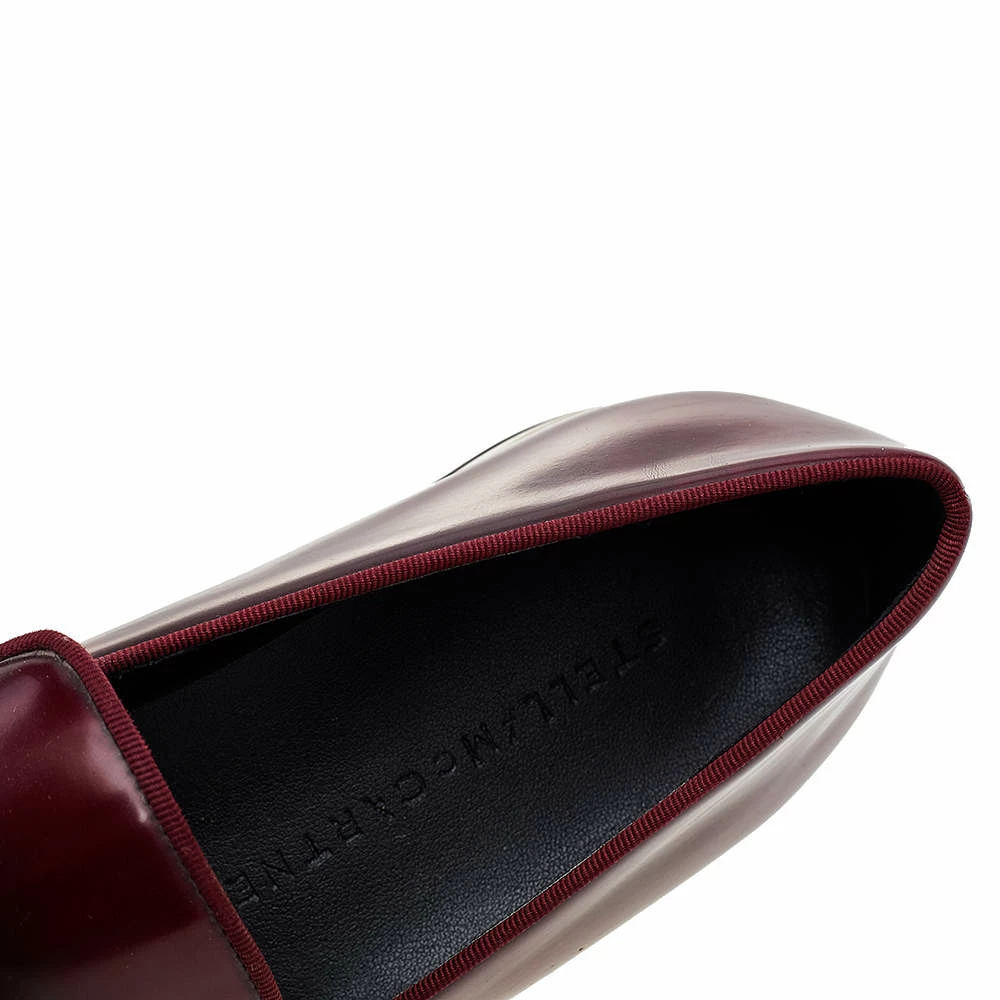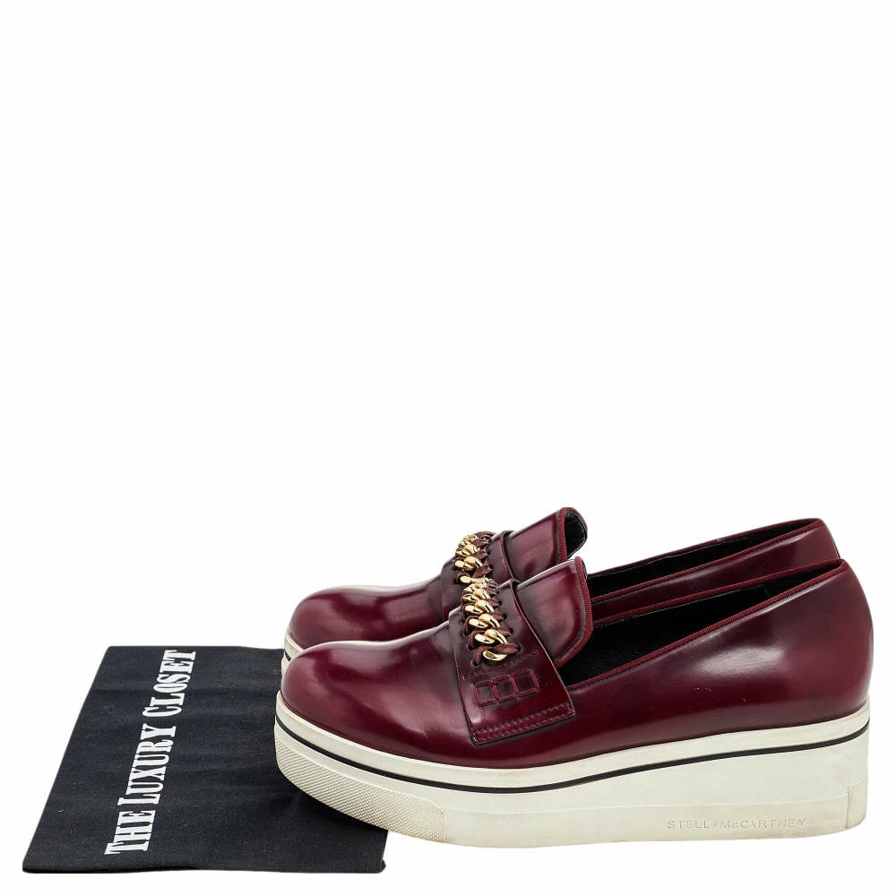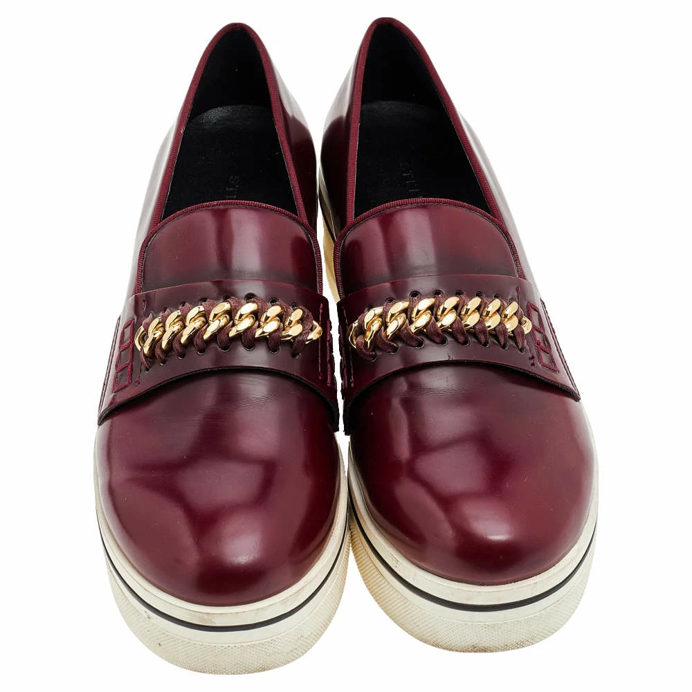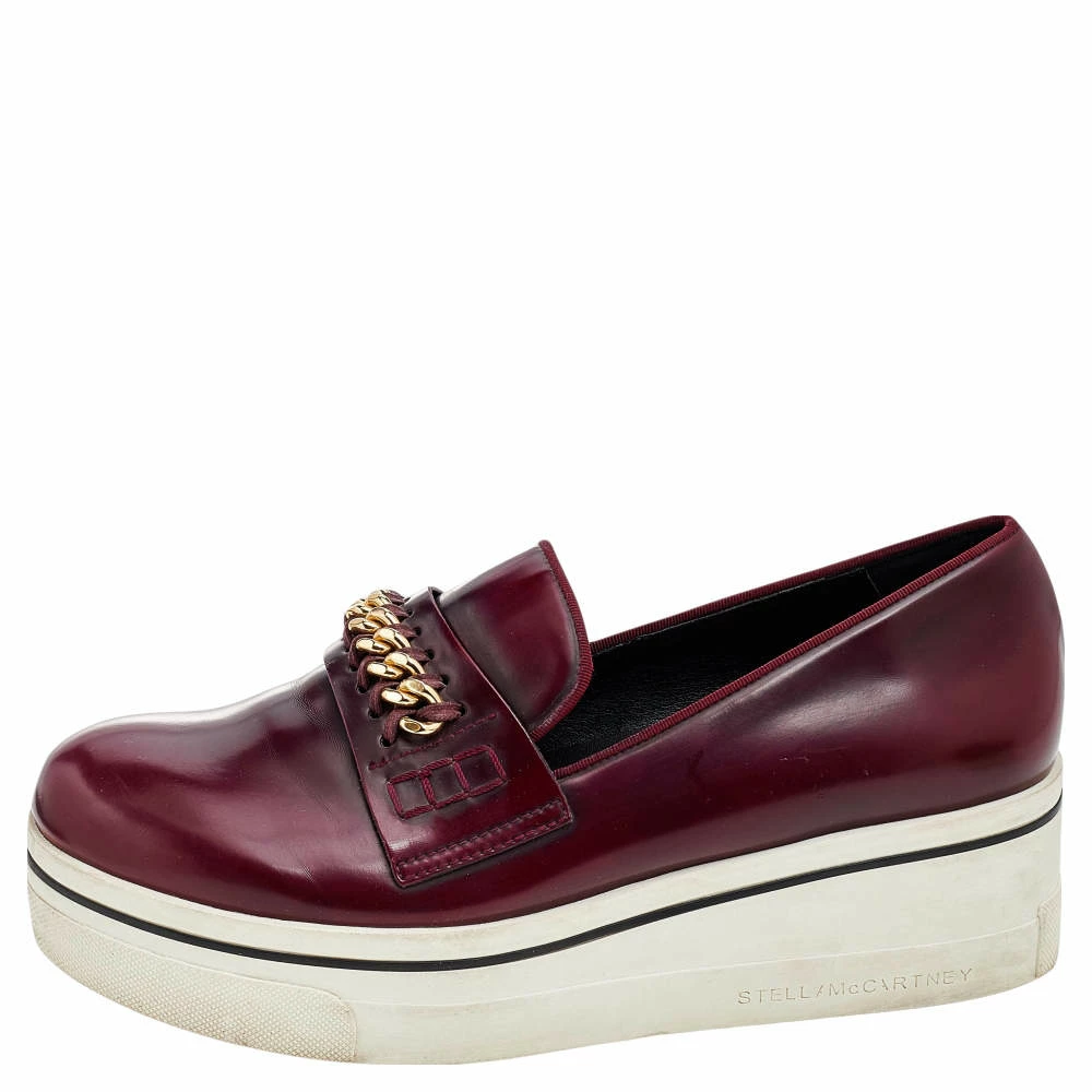 These loafers from the House of Stella McCartney are designed to offer comfort and style. They are made from burgundy faux leather on the exterior, with a gold-toned chain-link embellishment perched on their vamps. They feature thick platforms and a slip-on style. Look chic as you wear them!