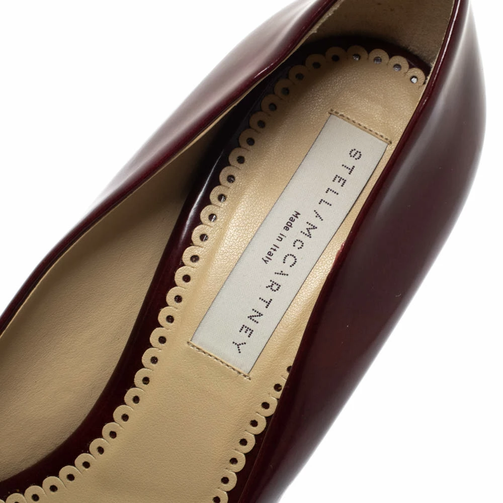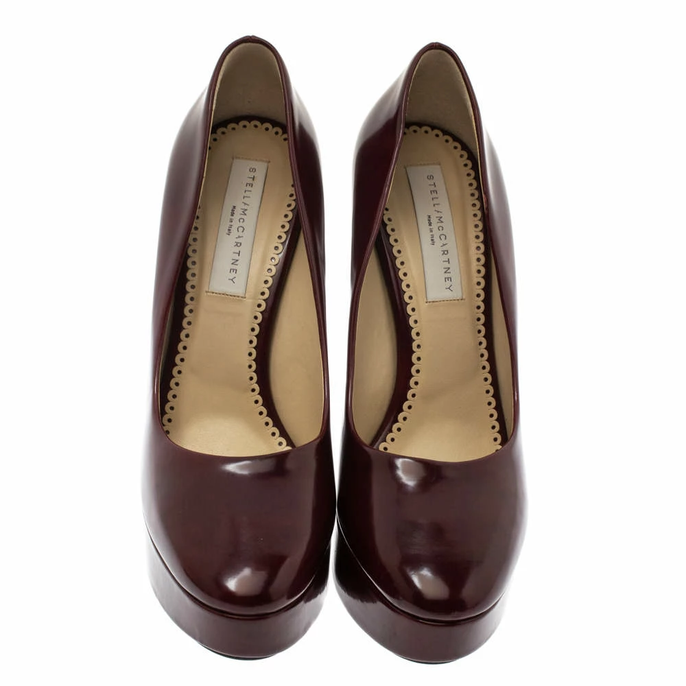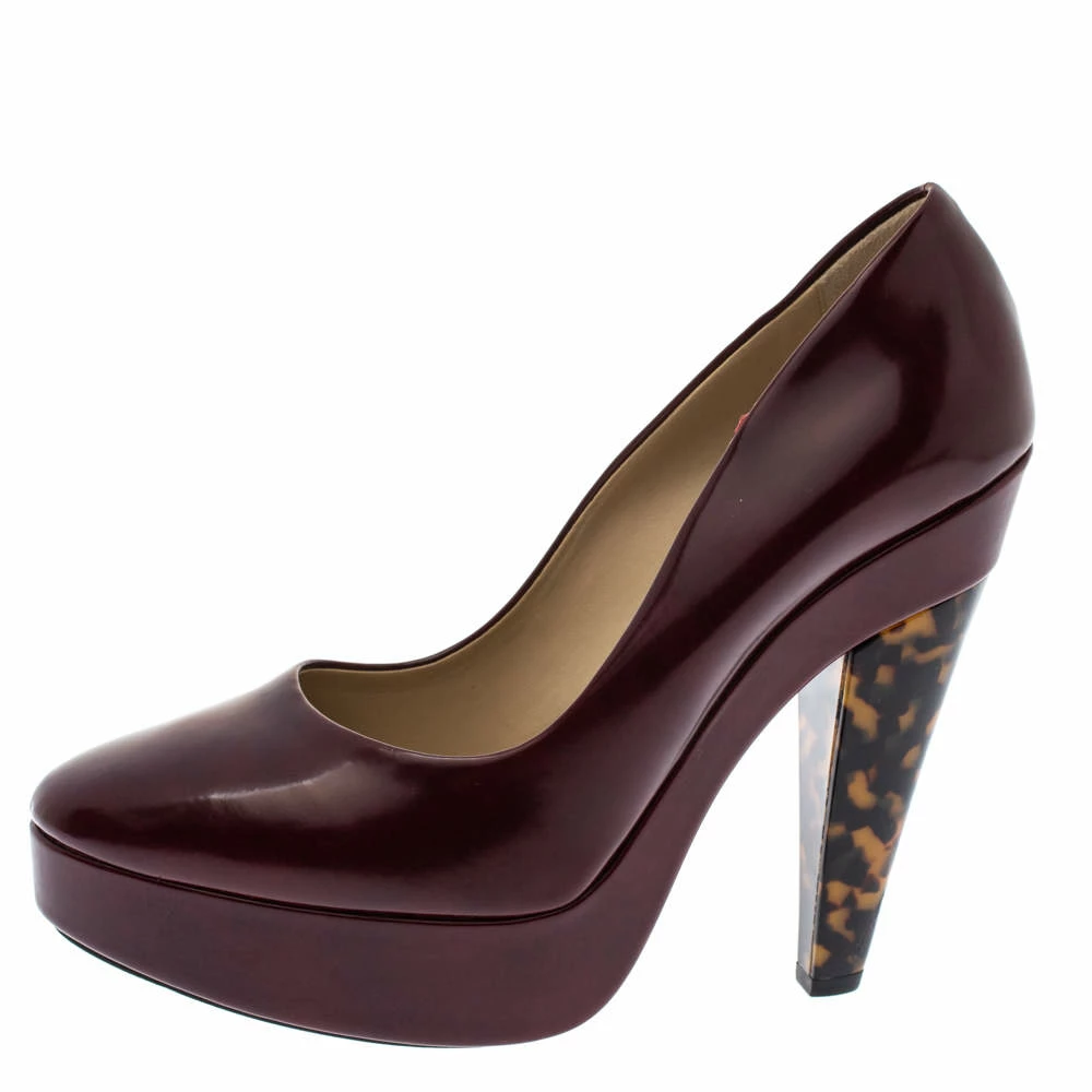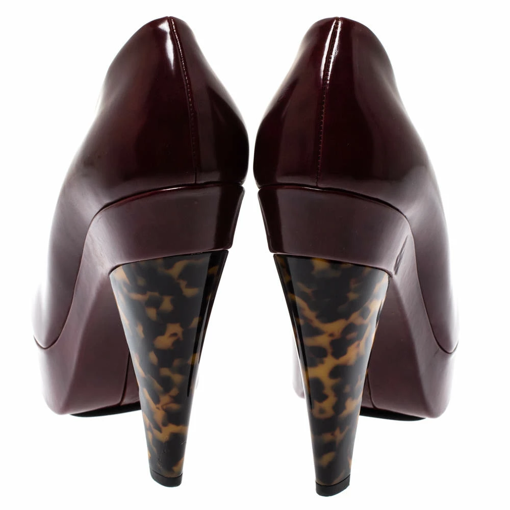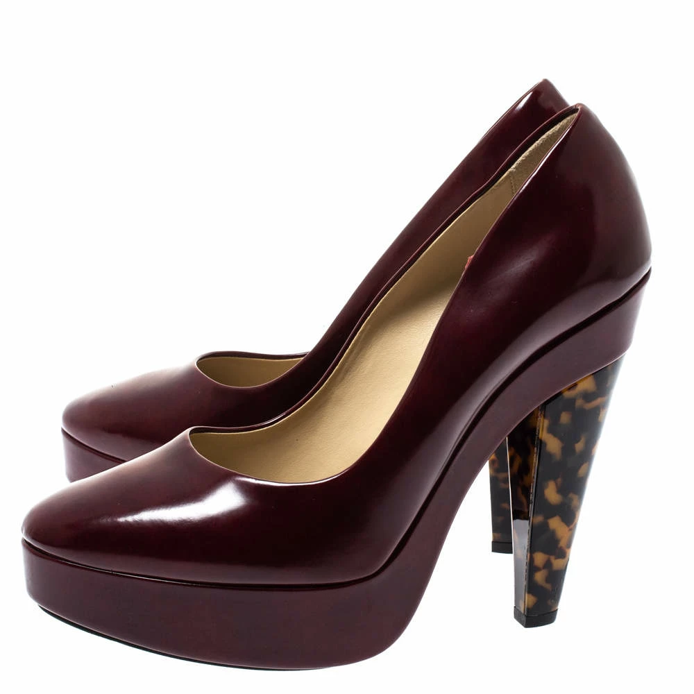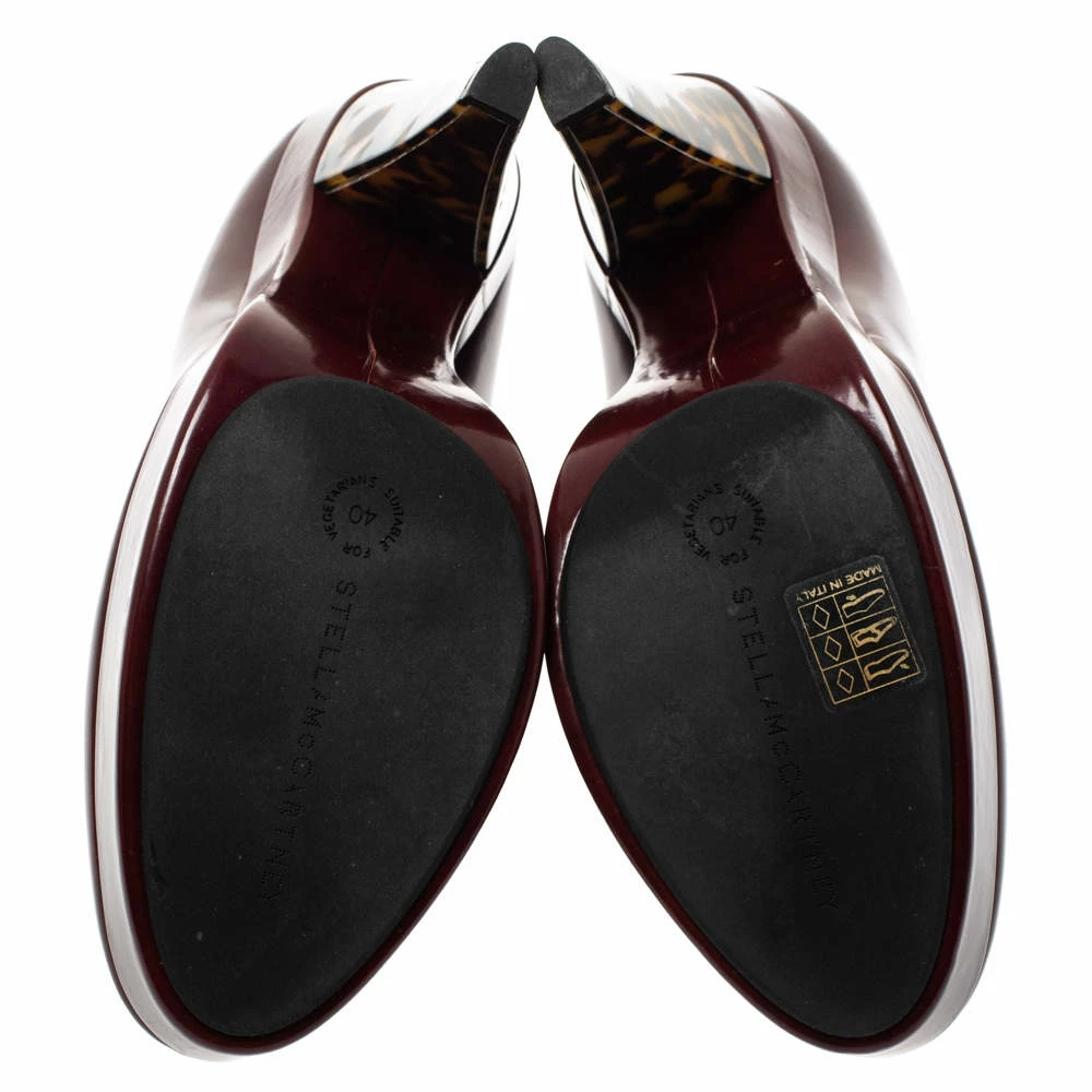 Stella McCartney never fails to impress when it comes to flawless designs and shoes. This pair of pumps will effortlessly complement any look. They are made from smooth burgundy faux leather with round toes. Their low platforms are coupled with 14 cm tortoise heels and faux leather lining.