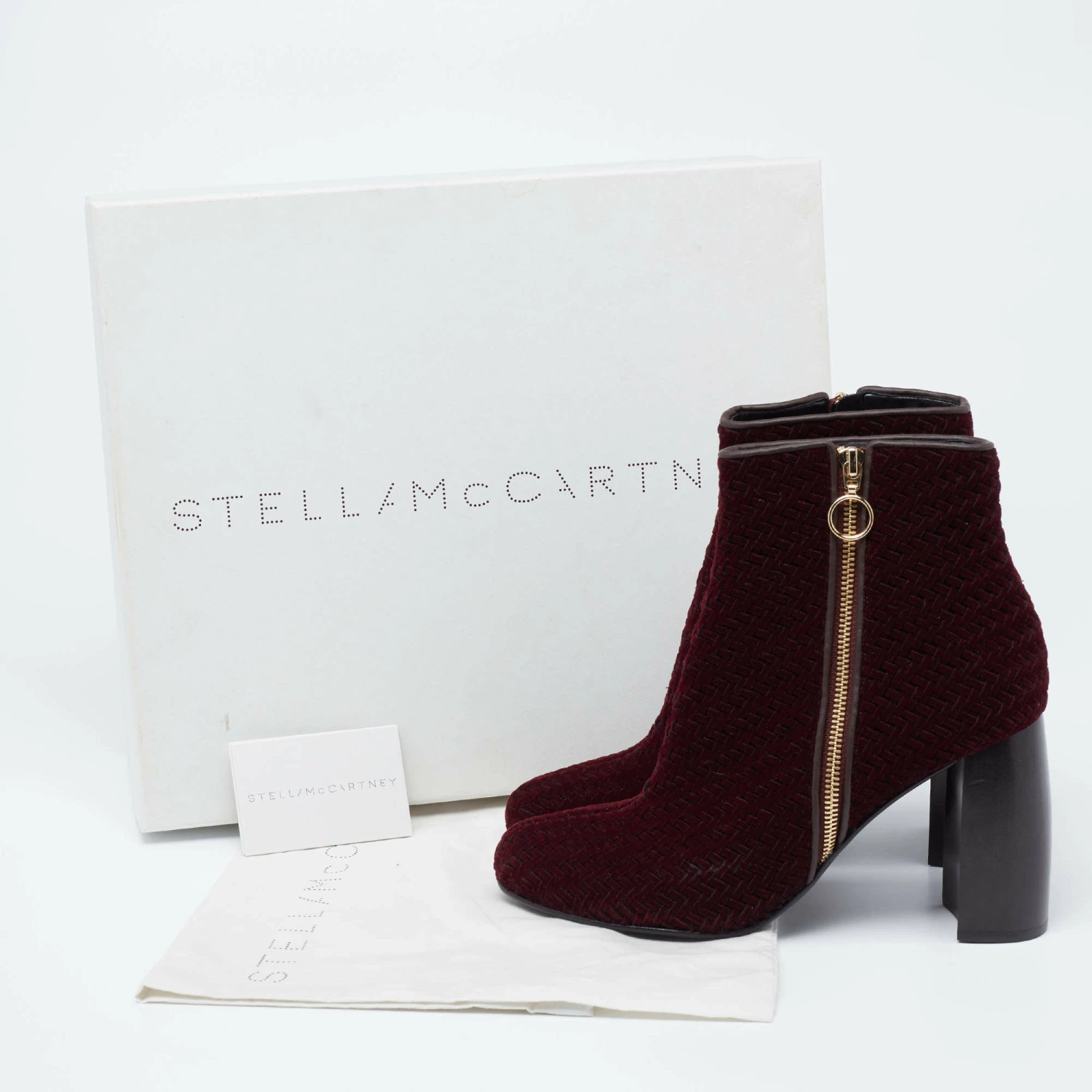 Take every step with confidence and panache in these stunning boots from Stella McCartney. They are styled using burgundy woven velvet into an ankle-length silhouette. They flaunt gold-tone hardware and block heels. These gorgeous boots are going to be your favorite in no time!