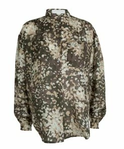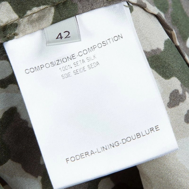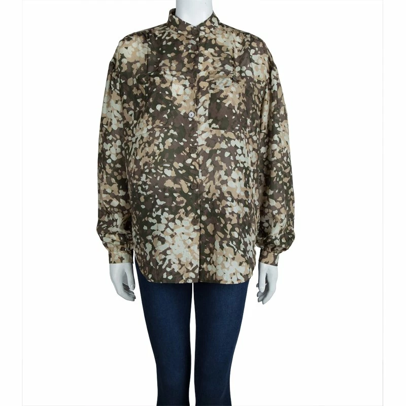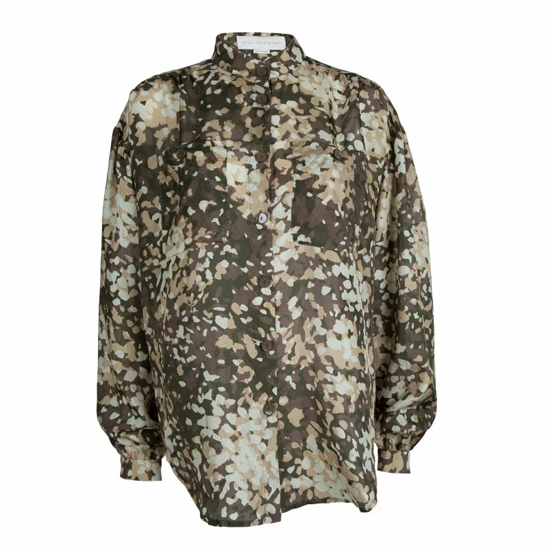 This piece by Stella McCartney combines style and comfort. Made of lightweight silk, it features a top closure collar button and a series of covered buttons down the front. It is swathed in a camouflage print and has long sleeves with buttoned cuffs.