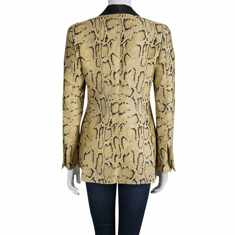 Made with a combination of rayon, cotton, silk, and polyester and a button to fasten in the front and two front pockets give this jazzy reptile print jacket a retro party vibe. Make a statement at parties with the deep, plunging neckline.