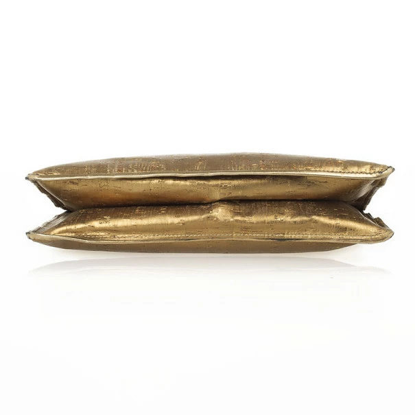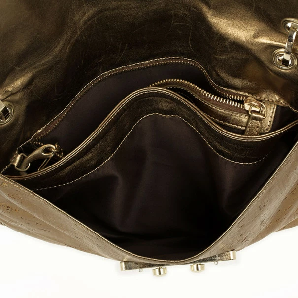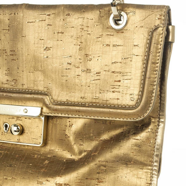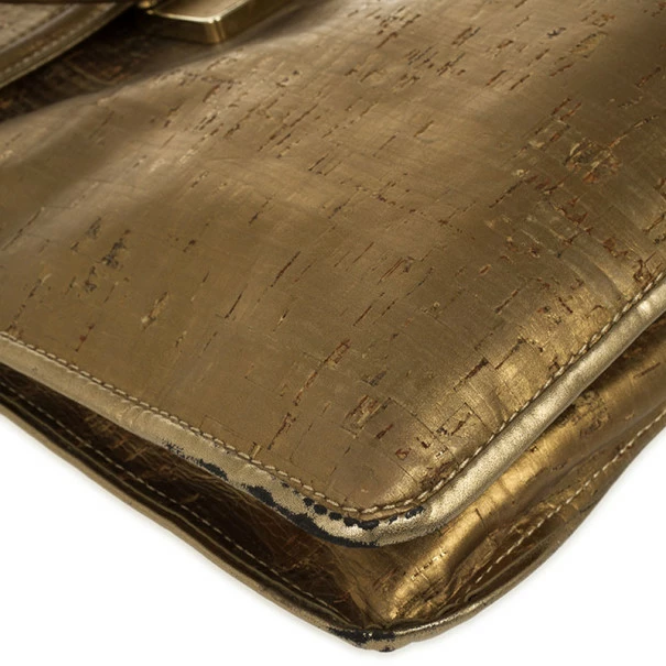 This shimmering copper bag with a chic appeal is truly astonishing. Crafted from metallic cork, the exterior features a flap front, a faux leather and gold-tone chain link handle and a detachable pouch. The brown fabric interior houses two compartments and a zip pocket. The back comes with a patch pocket.Original Retail Price: USD $1,277