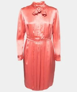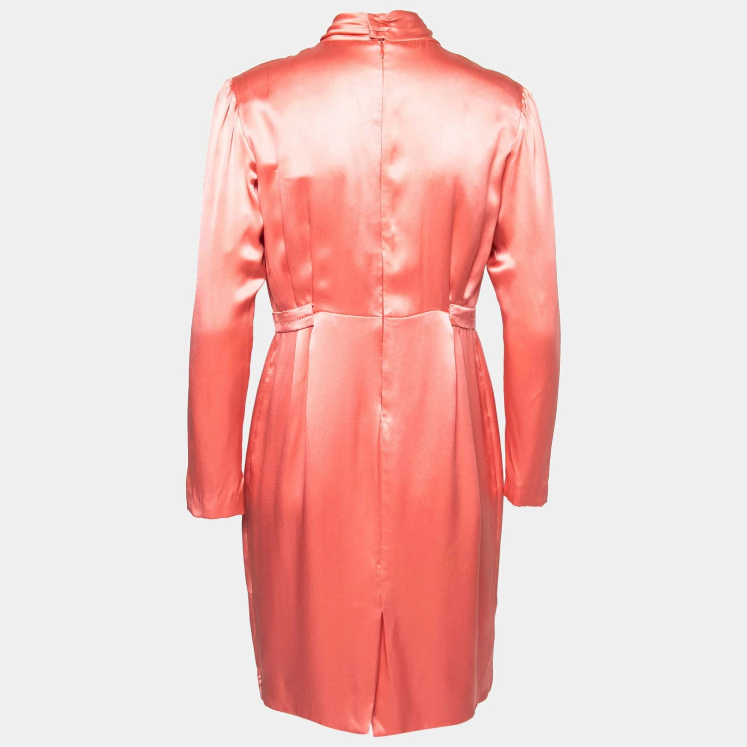 Stella McCartney brings you this gorgeous dress to add an element of femininity and demure to your appearance. It is fashioned in coral-pink silk satin fabric, with a bow accent perched on the neckline. Provided with zipper fastening, this dress flaunts long sleeves and pleated formations.